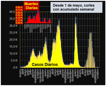 - Casos confirmados: 6’302.809; casos activos: 5.219; pacientes valorados como recuperados: 6’128.460; pacientes que pasaron la enfermedad en casa: 6’153.583; personas fallecidas por causa directa del Covid: 141.646; personas fallecidas por complicación de comorbilidad: 27.484; pruebas PCR aplicadas: 21’293.031, y con respecto a la vacunación se han aplicado al 9 de agosto 87’566.541 dosis.