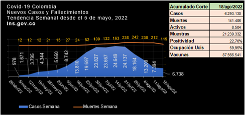 La siguiente figura permite identificar la tendencia semanal de la incidencia y la letalidad, aclarando que dicha periodicidad, se debe a la divulgación semanal de información de las cifras por parte del Instituto Nacional de Salud el día jueves, las cifras acumulativas para el corte del 18 de agosto también se visualizan en el gráfico.