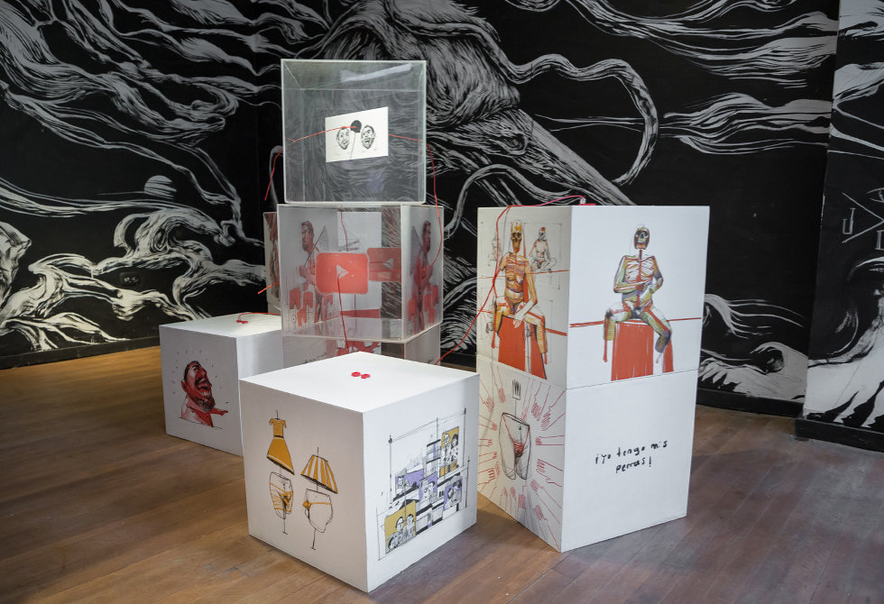 Con pinturas en acrílico, Camilo Acosta hace una análisis de estudio del canal de YouTube "Sin ánimo de ofender", un grupo de hombres que se reúnen a hacer comedia y que para este diseñador reflejan "machismo y masculinidades frágiles, mientras que el cuerpo de la mujer es visto como un objeto sexual".Estudiando la teoría de la risa, que expone Henri Bergson, en la que señala que la risa tiene un parte de complicidad, y El Manifiesto Cyborg, libro de Donna Haraway, Camilo ilustró un circuito en el que se correlacionaron imágenes que transgreden los límites de ciertas visiones del mundo. En los cubos se puede ver tres temas: una visión de mundo binario en el que la mujer es vista como objeto sexual, la sexualidad y el que transgrede los límites de la mirada.