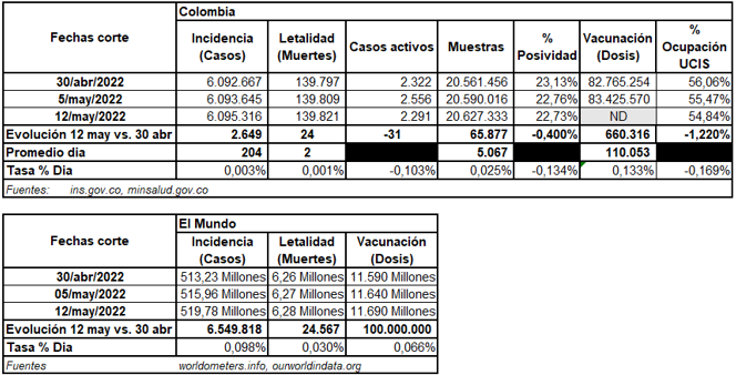 El balance comparativo semanal de la situación entre el 30 de abril y el 12 de mayo que se presenta a continuación, permite apreciar un continuo descenso de las cifras en nuestro país, las cuales en un promedio diario presentan una incidencia de 204 nuevos casos, una letalidad diaria de 2 personas, y a la baja tanto el índice de positividad como la ocupación de las Unidades de Cuidado Intensivo, acerca del agregado de vacunación, para el corte del 12 de mayo, MinSalud no reportó información: