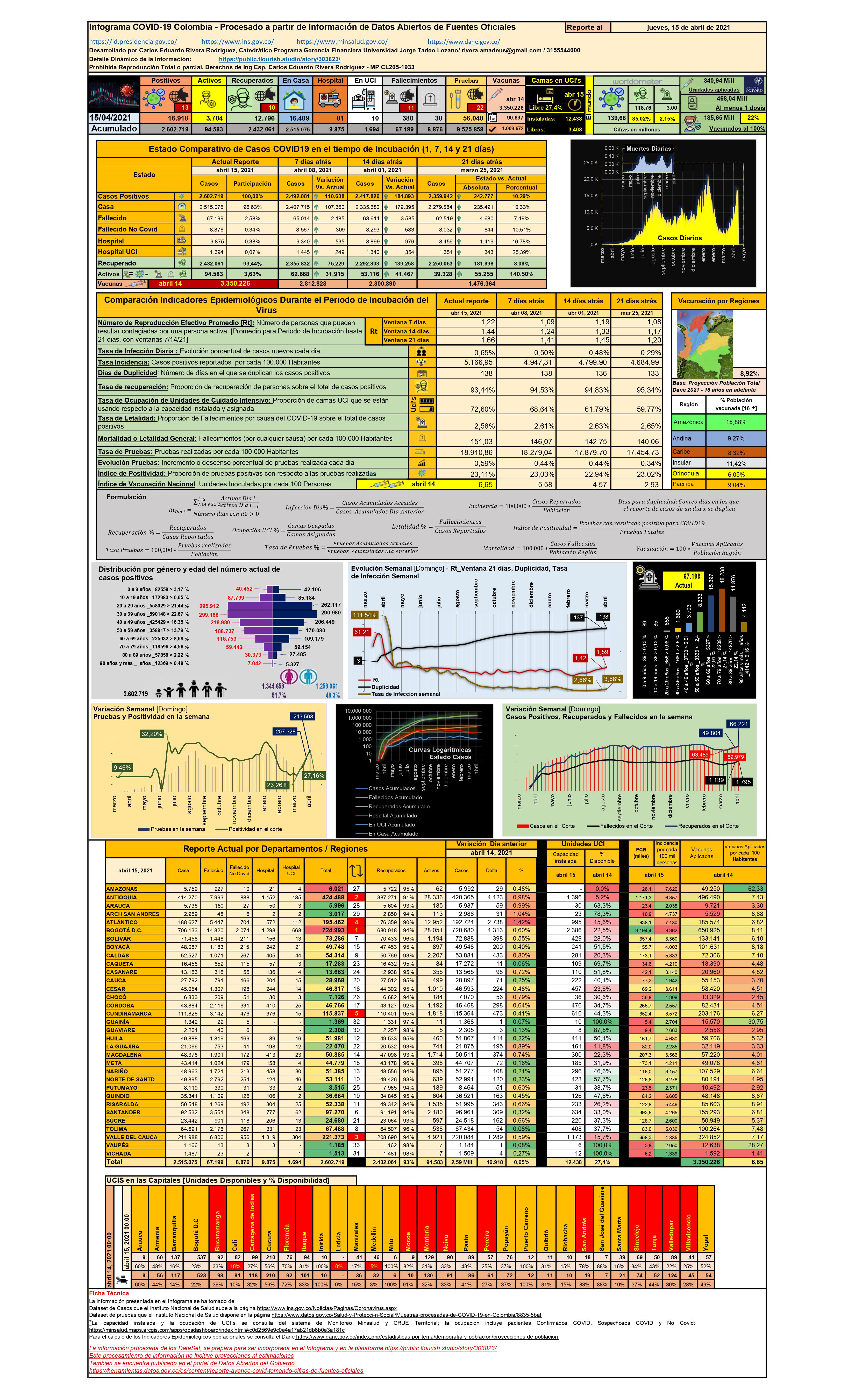 El tercer pico está presente en todas las regiones del país, a nivel de departamentos o distritos, presentando un mayor nivel de infección: Bogotá (725 mil casos), Antioquia (424 mil casos) y Valle del Cauca, con 221 mil casos; desde el punto de vista de la ocupación de UCIs, a corte del 15 de abril, Antioquia tiene una ocupación disponible del 5,2% de un total de 1.396 camas instaladas, y a nivel de capitales, las que disminuyeron la disponibilidad con respecto al día anterior son: Bucaramanga (33% o 92 camas), Cartagena (27% - 99 camas), Florencia (70% - 76 camas), Ibagué (31% - 94 camas), Mocoa (82% - 9 camas), Montería (31% - 29 camas), Neiva (33% - 90 camas), Pereira (25% - 57 camas), San Andrés (78% - 18 camas), y con disponibilidad 10% o menos están: Cali (10% - 82 camas) y Medellín (5% - 46 camas). La vacunación analizada regionalmente, y desde el punto de vista de proyección de población DANE para el 2021, presenta para la Región Amazónica que el 15,88% de la población mayor a 16 años ya se le aplicó vacuna; Región Andina 9,27%; Región Caribe 8,32%; Región Insular 11,42%; Orinoquía 6,05%, y la Región Pacífica 9,04%.