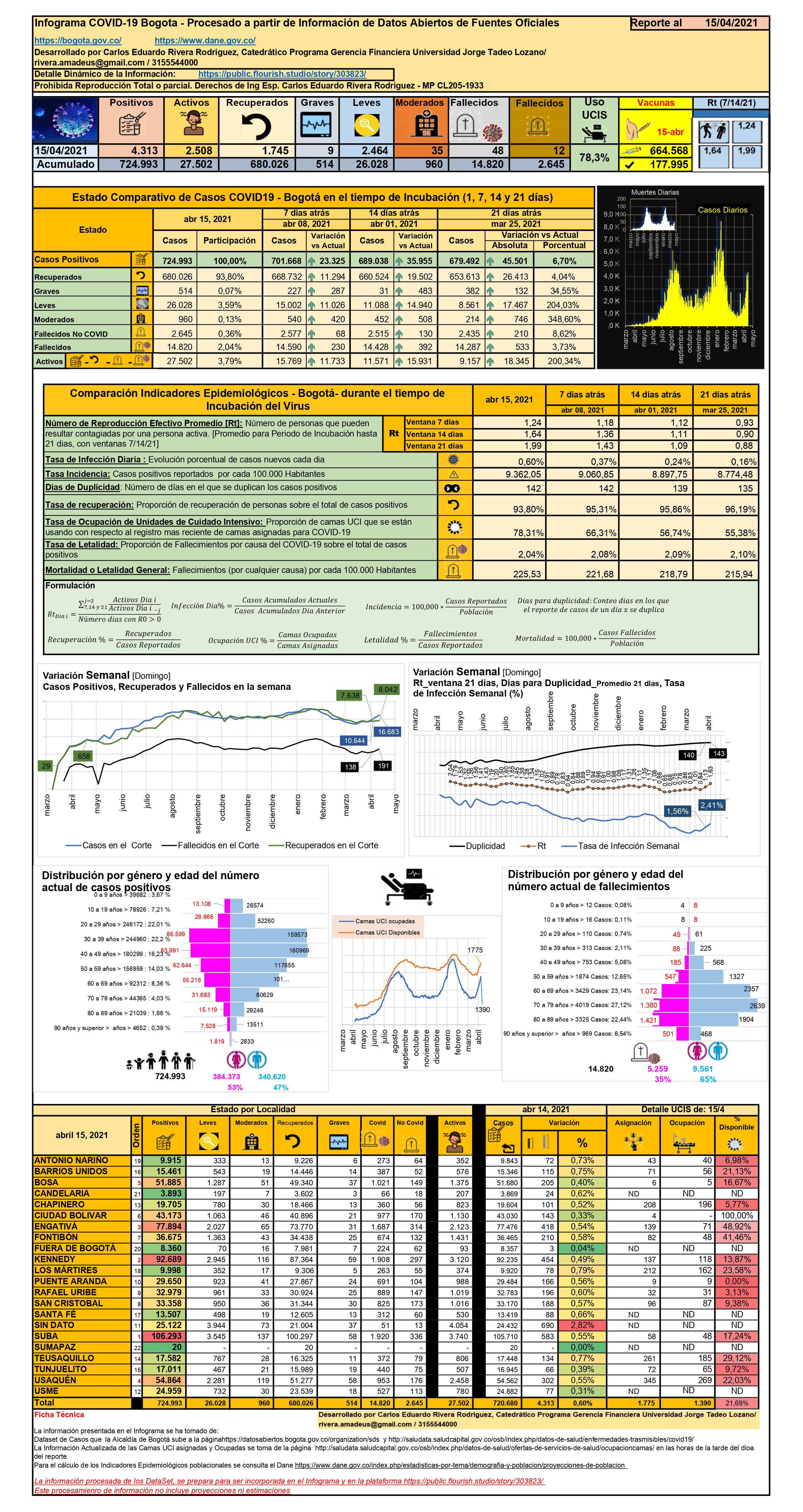 Nuestra Capital llegó el 15 de abril a 724.993 casos positivos, comparados con el acumulado al 8 de abril de 701.668 (23.325 en una semana), lo que implicó 4.313 eventos en el día; es de anotar que la duplicidad de casos se presenta cada 142 días. El saldo acumulado de fallecimientos a la fecha de corte de este artículo fue de 14.820 en comparación con las 14.590 personas a 8 de abril, donde para la fecha de corte se presentaron 48 eventos.