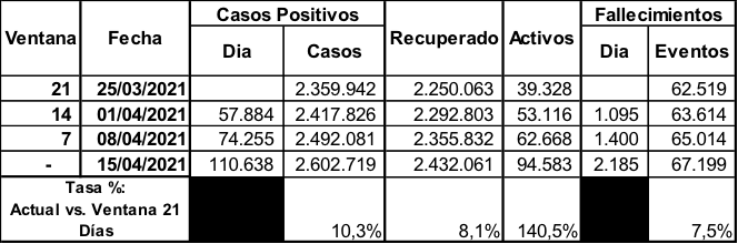 Igualmente, el deterioro de los indicadores epidemiológicos en las ventanas epidemiológicas 7, 14 y 21 días se puede apreciar mas fácilmente mediante un cuadro comparativo de las cifras que explica el sentido de unidad de medida: