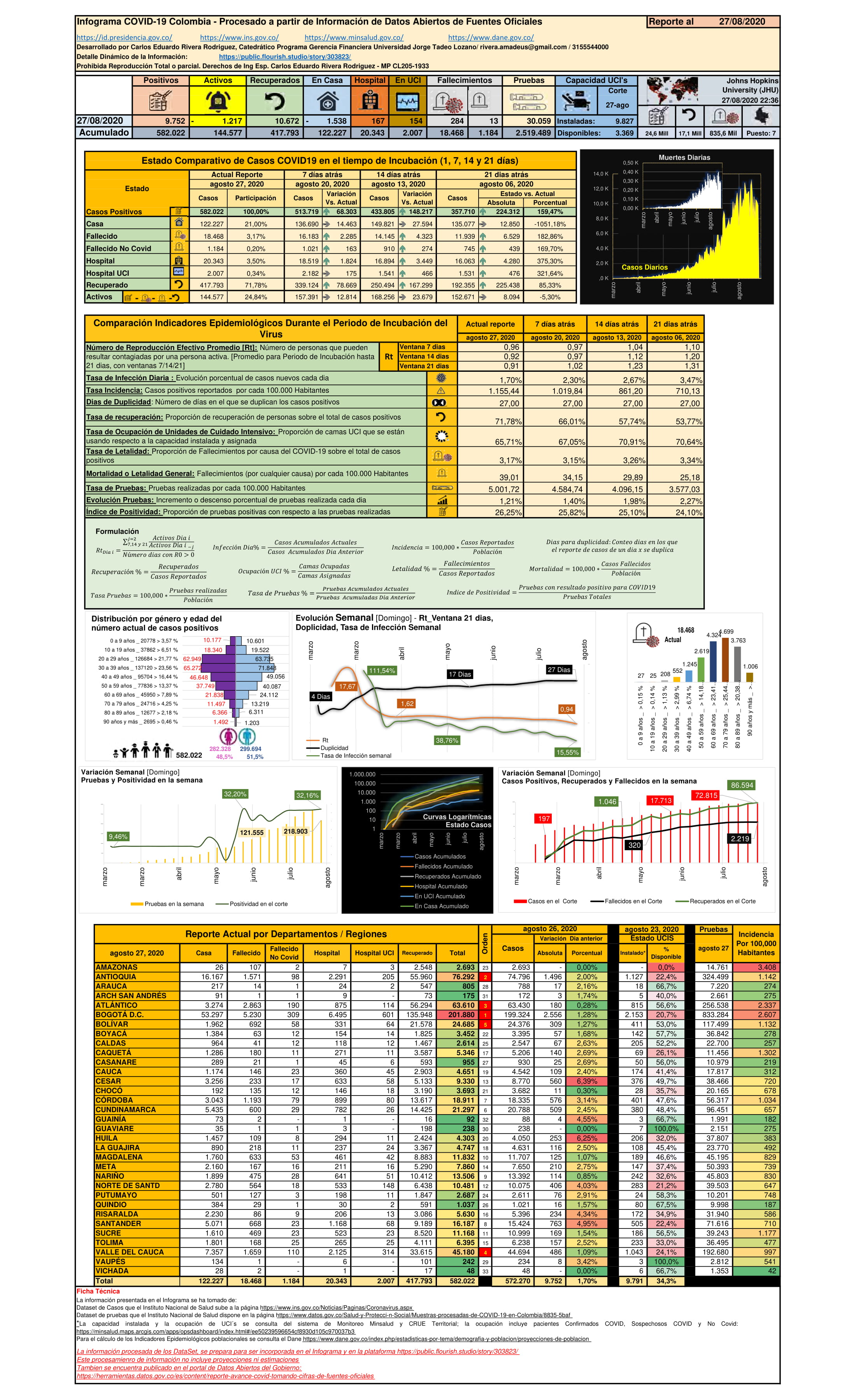 - El número de reproducción efectivo (Rt_Promedio) en la ventana de 14 días en un claro descenso semana a semana de este mes: 1,20, 1,12, 0,97 y 0,92 personas a ser infectadas por un caso positivo; acompañado esto de la duplicidad de los casos que a hoy es de 27 días. La tasa de infección diaria, con una trazabilidad de tres semanas, es 3,47%, 2,67% y 2,30%; al 27 de agosto es de 1,70%.