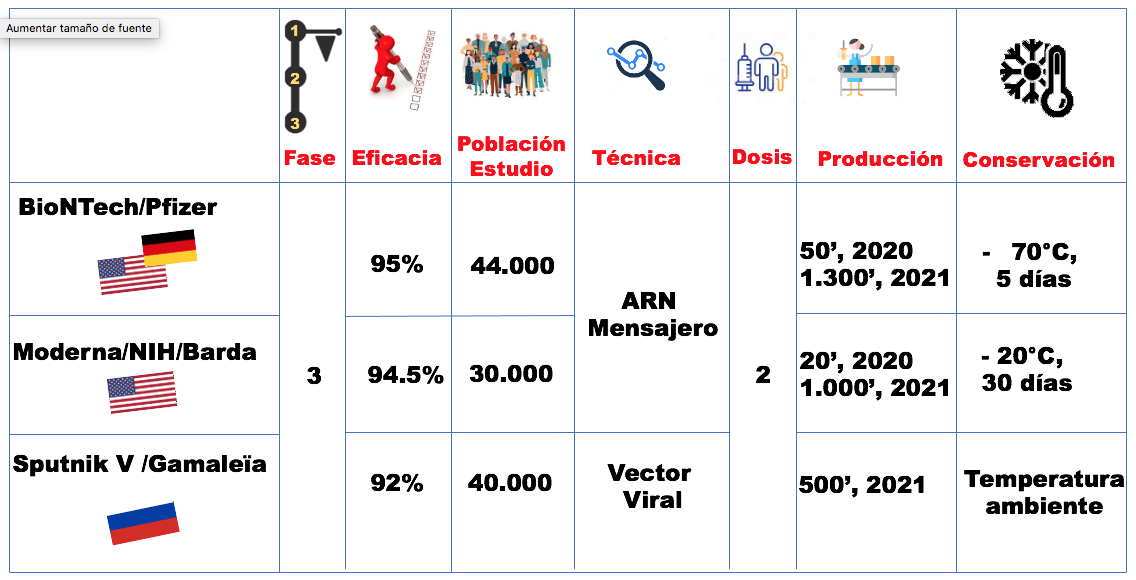 La primera semana de noviembre trajo buenas noticias sobre la evolución de la vacuna; dos semanas después, tenemos un panorama más alentador con la confirmación de 3 vacunas [BioNTech/Pfizer, Moderna/NIH/Barda y Sputnik V/Gamaleïa] finalizando la fase 3 con una eficacia mayor al 90%; esto ya es un indicativo del final de la carrera en búsqueda de herramientas biológicas efectivas, seguras y sin efectos adversos importantes que frenarán la pandemia. Lo más importante, según lo informan las casas farmacéuticas, es que en el proceso intervinieron, entre otros grupos, minorías étnicas y personas mayores de 65 años. ¿Ahora qué sigue? el proceso de registro derivado del concepto de grupos de ciencia y académica independientes a las farmacéuticas elaboradoras de cada producto, los cuales analizan la veracidad de los dossier [registros documentados] con la evolución de cada vacuna. Ya con el debido registro, seguirán las campañas de inmunización masiva por parte de los gobiernos. El gráfico adjunto compara las vacunas en mención presentado su eficacia, número de personas participantes en el proceso, tecnología desarrollada, dosis requeridas, la producción estimada entre 2020 y 2021 y las condiciones de conservación.