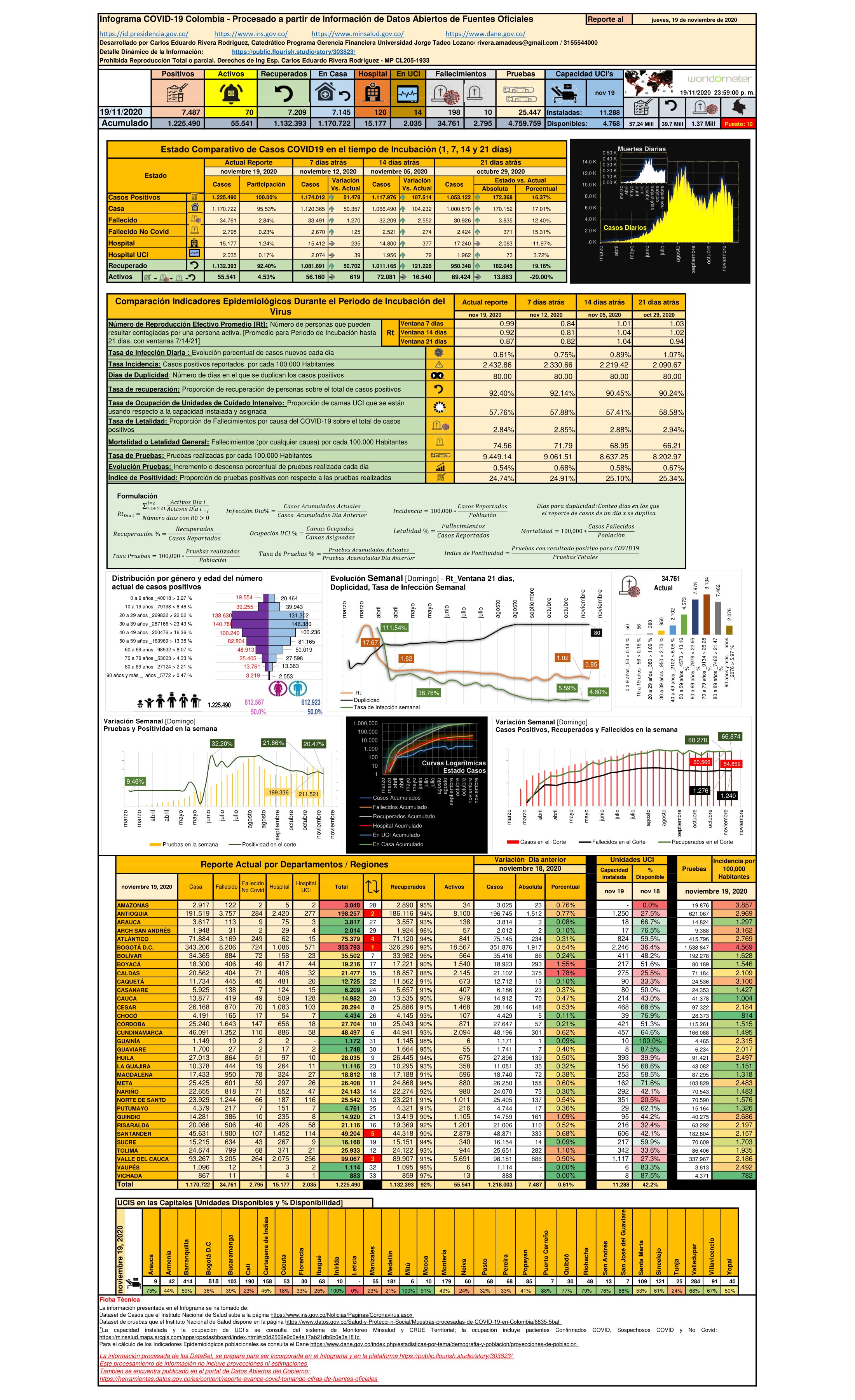 Terminado la tercera semana del mes de noviembre, el mundo superó los 57,2 millones de casos [4,1 millones de casos en una semana]; con una recuperación del 69,4%, se tienen 39,7 millones de personas [2,5 millones en una semana] que superaron el virus, pero infortunadamente con una letalidad del 2,44%, se superaron 1,4 millones de fallecimientos [100 mil en la semana]. Miremos como se comportó nuestro entorno con corte al 19 de noviembre.