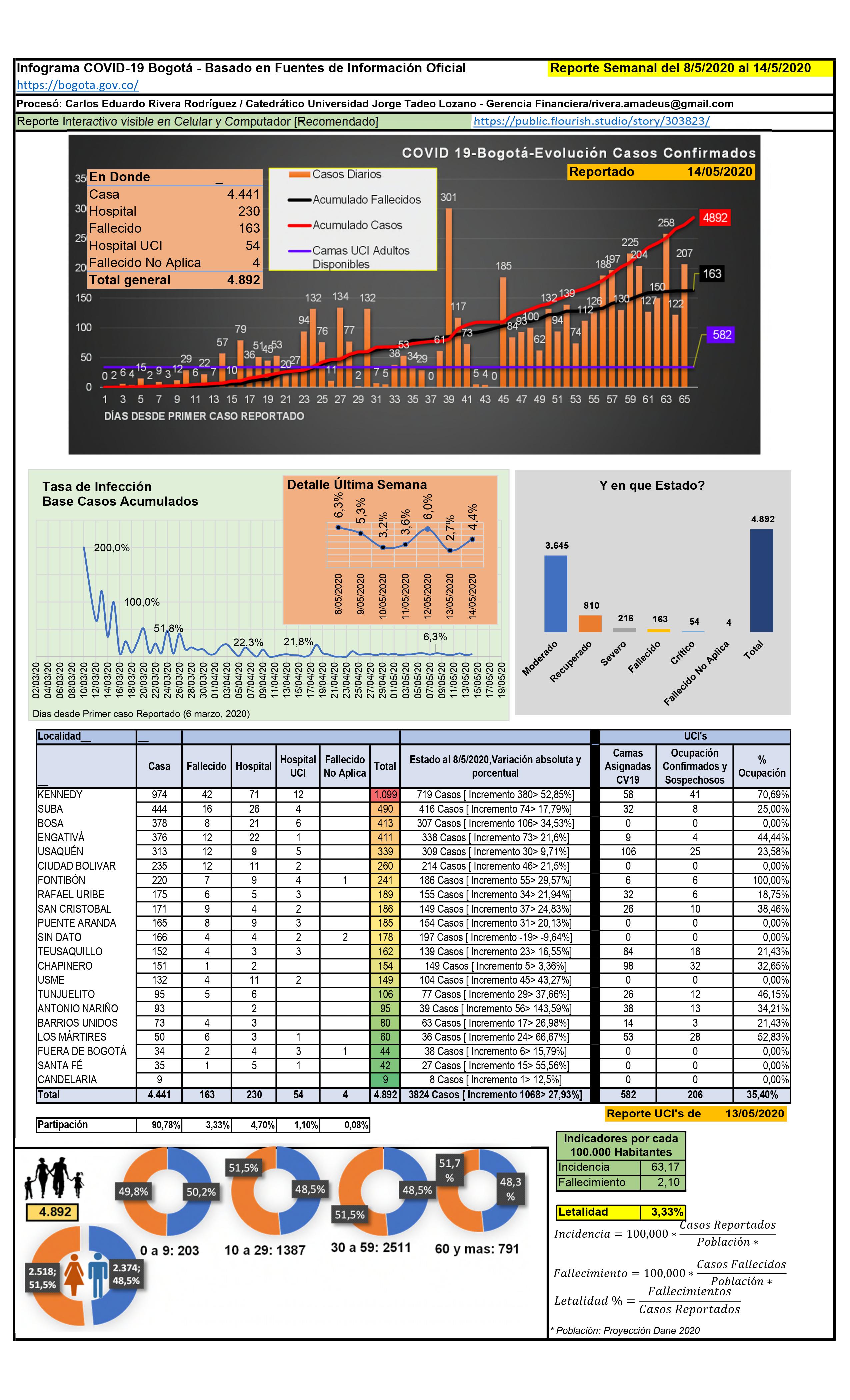 Es de anotar que las cifras aquí reportadas entre el 8 y 14 de mayo corresponden a la situación de dos semanas atrás, cuando se estaba en plena aplicación de las medidas de cuarentena a nivel Nacional, pero se ha visto por diversos medios el incumplimiento de normas que han conducido a retomar medidas de aislamiento en puntos objetivo específicos del país y de Bogotá. Se inició también una reactivación progresiva de algunos sectores económicos, situación que se irá reflejando en los días venideros, y que tiene cierta similitud en los países de Europa y Asia donde se han visto sucesos de recontagio.