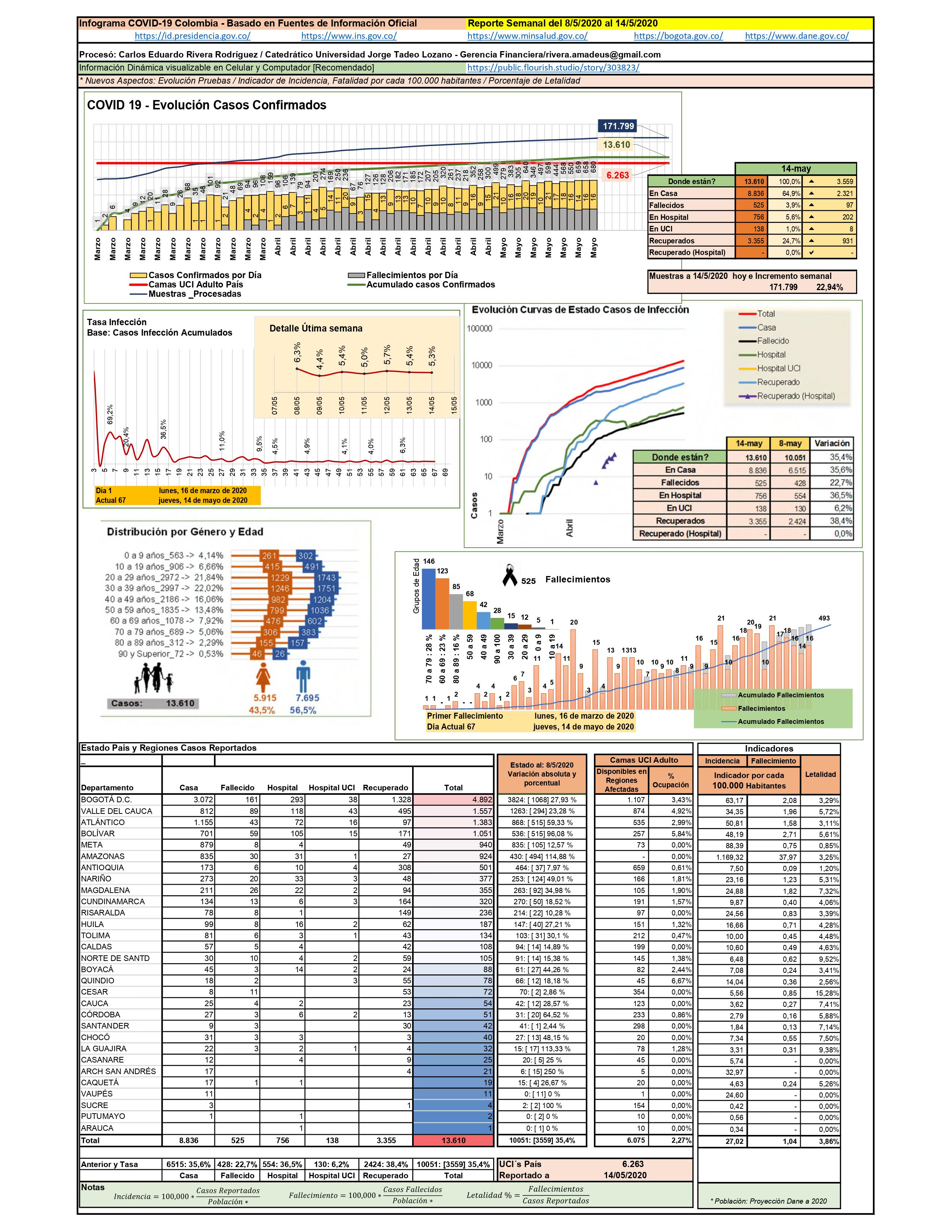 Al 14 de mayo, ya son treinta los departamentos con contagio; Bogotá sigue siendo la región del país con mayor número de casos, con 4.892 contagios, correspondientes al 36% de los casos en el país, presentándose desde el 8 de mayo 1.068 nuevos casos, lo que equivale a un incremento semanal del 28%; continúan en nivel de contagio Valle del Cauca, Atlántico, Bolívar y Meta. Se destaca el incremento en el Amazonas que, para el 8 de mayo, contaba con 430 casos, y para el 14 de mayo se reportaron 924 nuevos contagios, lo que implica un incremento del 114.88%, razón por la cual el Gobierno Nacional declaró, a partir del 15 de mayo, cuarentena total hasta finales del mes de mayo en dicho departamento.