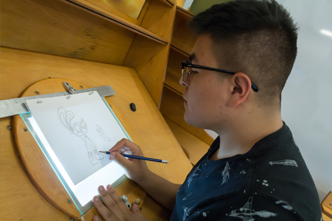 En esta Sala se pueden realizar simultáneamente procesos análogos de dibujo con papel en mesas de luz y en las tabletas Cintiq, comenta el profesor Diego Ríos. La ventaja que da lo análogo es otro tipo de competencia en términos de la sensibilidad. Acá no hay Ctrl+z, lo que obliga a que la intención con la que se trabaja sea mucho más concreta, no se puede perder el tiempo haciendo “mamarrachos”. Por su lado, las actividades manuales generan competencias profesionales de más precisión, de aprovechar el tiempo. De manera que cuando los estudiantes llegan a lo digital ya tienen competencias mucho más refinadas.
