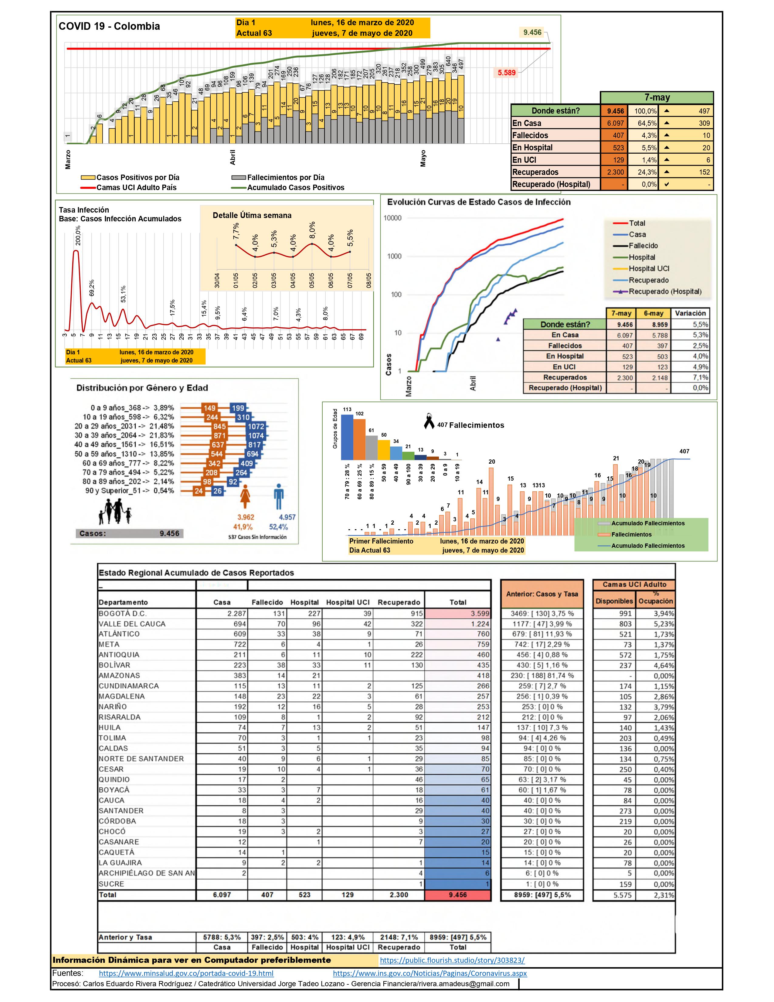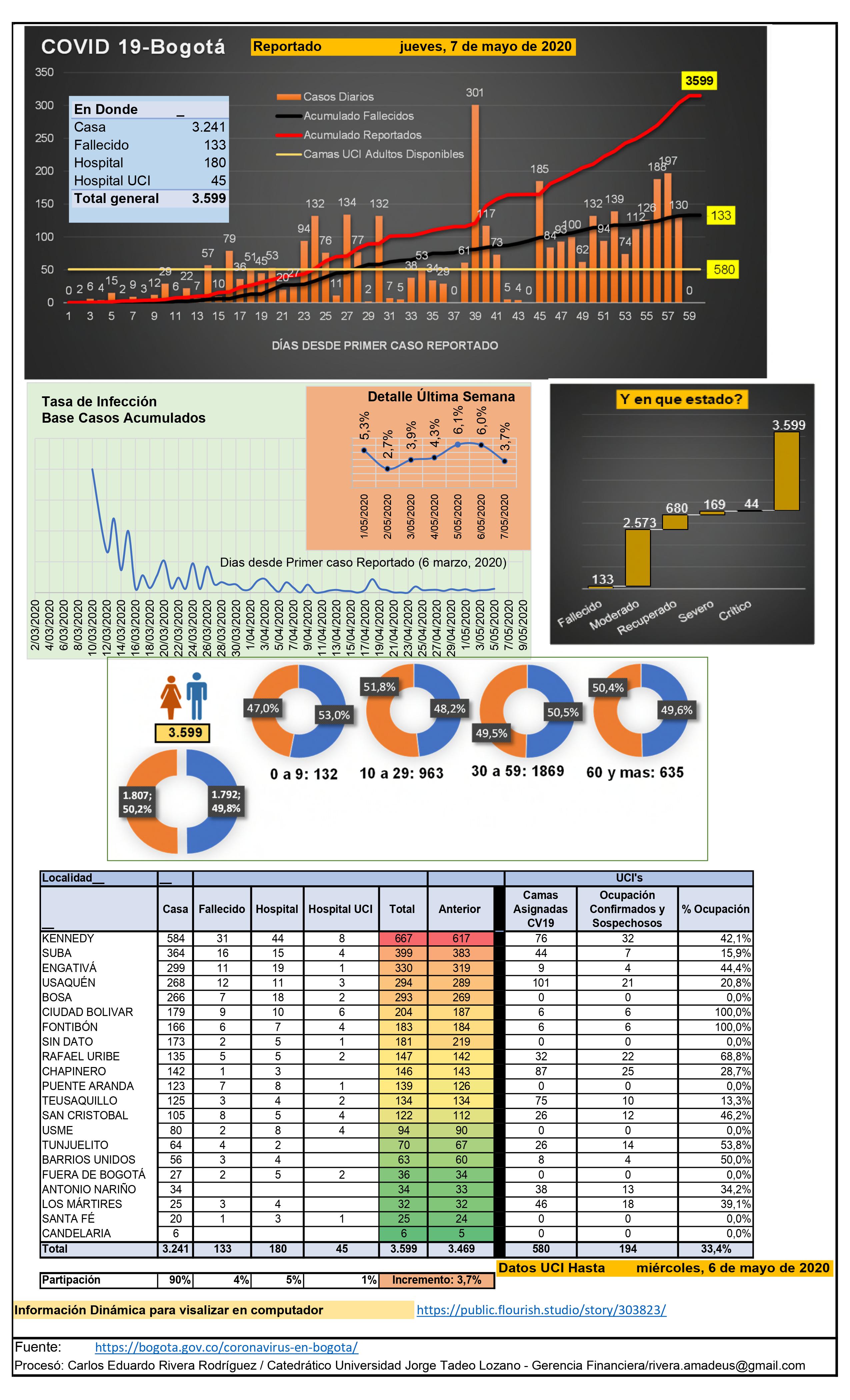 - Al día 7 de mayo se presentan 3.599 casos de infección, de los cuales se han recuperado 680 personas (18.9%); han requerido hospitalización 180 casos (5%); 129 han necesitado cuidado intensivo (1.25%), y el número de fallecimientos es de 133 personas (3.69%).