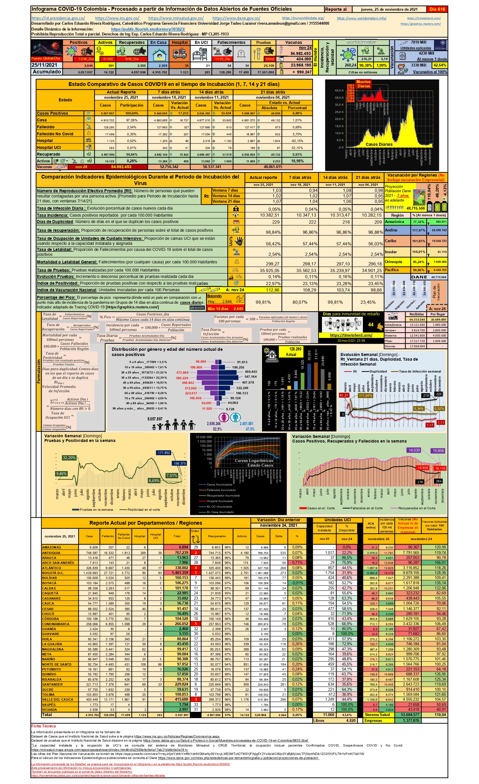 Nuestro País el 25 de noviembre presentó 2.644 nuevos casos positivos, con respecto al 18 de noviembre (Ventana Epidemiológica 7 días) fueron 17.232 nuevos casos y en la ventana de 14 días (11 de noviembre) fueron 33.634 casos; se llega a un acumulado de 5’057.897 casos y esta cifra nos ubica en el puesto 12 del escalafón mundial de ocurrencia.