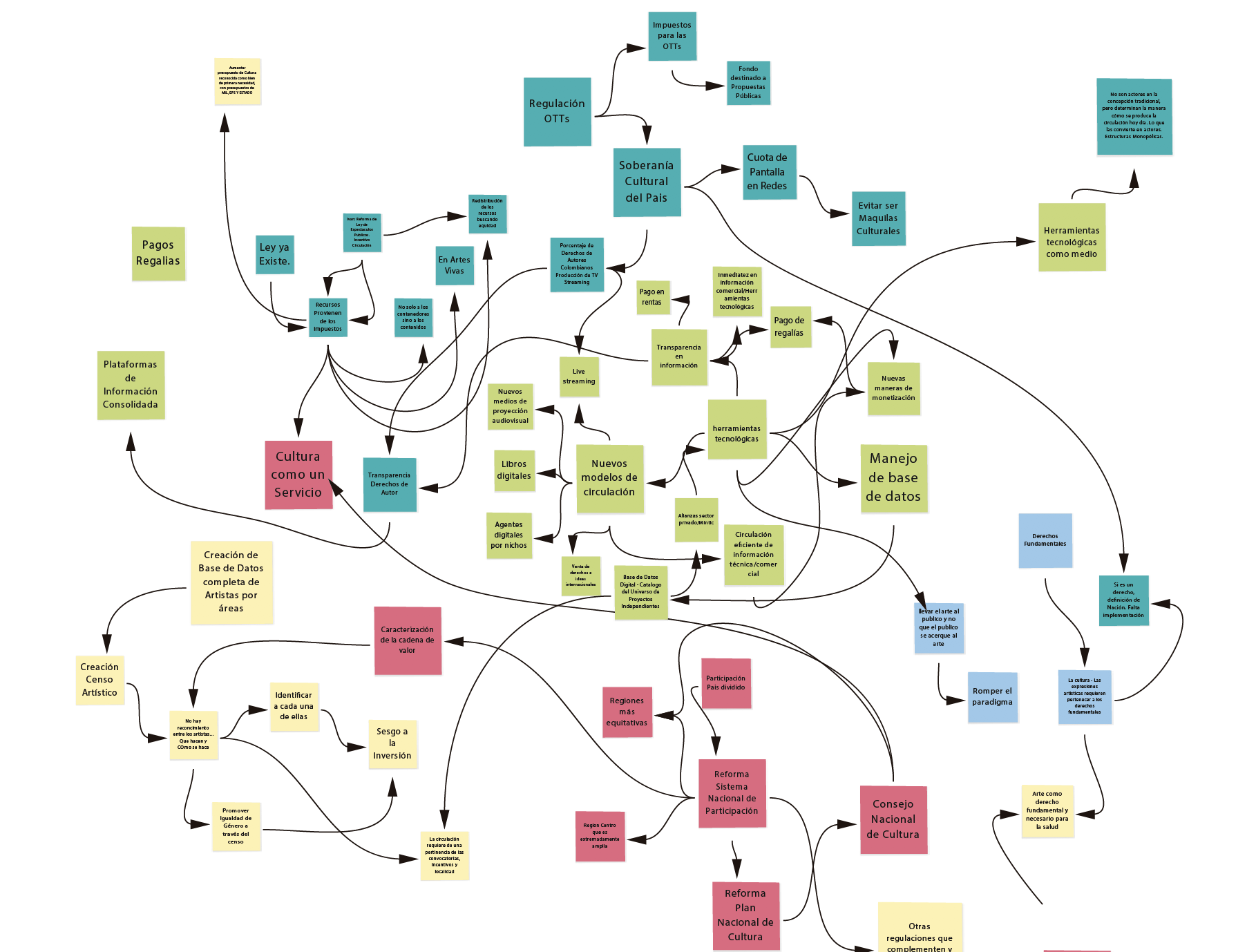 "Esta metodología europea tiene como principio básico analizar los problemas como problemas complejos. En la medida en que se fue construyendo, tuvimos la suerte de estar tocando las fibras de la cultura en Colombia, a partir de las conversaciones entre la gente que hace parte del sector editorial, libreros, músicos, artistas, representantes de aplicaciones como Spotify, dueños de circos y un sinnúmero de personas que representan el universo de la cultura en el país. Todo se trabajó bajos las direcciones de Artes, de Emprendimiento y de Audiovisuales, Cine y Medios Interactivos del Ministerio de Cultura.