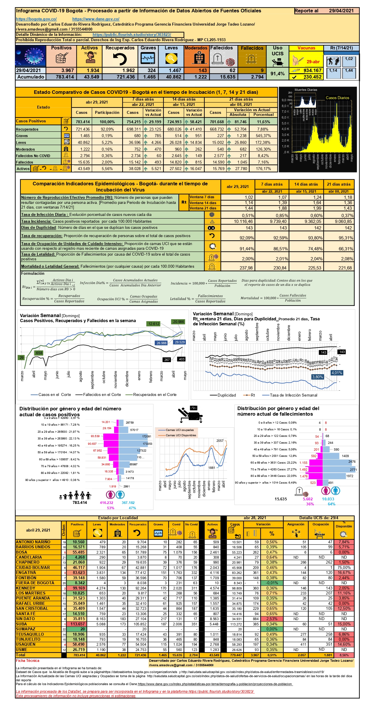 Bogotá llega a 783.413 casos, de los cuales 3.967 casos ocurrieron en el día de corte, 15.635 fallecimientos, y en el día de corte ocurrieron 62 eventos; se han recuperado 1.962 personas (92,09%) y se mantienen activos 43.549 casos (5,56%); con respecto a la vacunación, el Observatorio de Salud de Bogotá reporta, para el corte del 29 de abril a las 11:59 p.m., que se han aplicado 934.167 unidades y 230.452 personas ya cuentan con el esquema completo de vacunación. El Indicador Rt (velocidad promedio de infección) se encuentra en la ventana de 14 días en 1,14, y ha venido en descenso desde hace 21 días cuando el indicador fue de 1,36; por otro lado, la ocupación de Unidades de Cuidado Intensivo, el cual para el 28 de abril a las 23:59 horas, es del 91,4%, con una disponibilidad de 176 camas de una capacidad instalada de 2.057. A nivel de localidades con disponibilidad de UCIS mayor al 10% se encuentran únicamente Engativa (16,67%, con 24 camas disponibles), Los Mártires (11,16%, con 26 camas disponibles), San Cristóbal (12,50%, con 15 camas disponibles), Suba (15%, con 9 camas disponibles) y Usaquén (14,6%, con 60 camas disponibles)