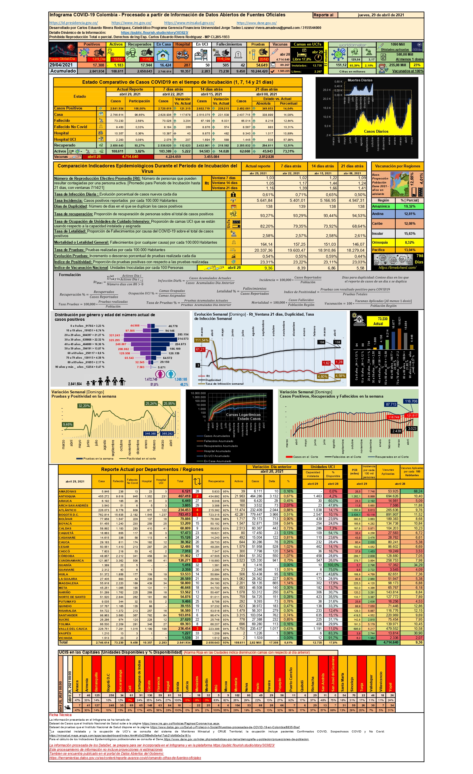 Colombia se posiciona en el puesto 12 del ranking de contagios con 2’841.934 casos, de los cuales 17.308 casos ocurrieron en el día de corte, 73.230 fallecimientos (2,57%), ocupando el puesto 11 a nivel mundial, y en el día de corte se llegó al récord de 505 eventos en un día (lo que implica puesto 6 a nivel mundial); se han recuperado 2’650.643 pacientes (93,26%) y se mantienen activos 108.611 casos (3,82%); con respecto a la vacunación, el Ministerio de Salud reporta, para el corte del 28 de abril a las 11:59 p.m., que se han aplicado 4’714.640 unidades (9,36 vacunas por cada 100 habitantes) y 1’505.225 personas ya cuentan con el esquema completo de vacunación; este último aspecto conduce a que se ha cubierto el 4,01% de la población mayor a 16 años. Consultando el 29 de abril (7:00 p.m.) el portal https://timetoherd.com/, se encuentra que para alcanzar la inmunidad de rebaño (70% de la población mayor a 16 años) se requieren 708 días. El Indicador Rt (velocidad promedio de infección) se encuentra en la ventana de 14 días en 1,05, y ha venido en descenso desde hace 21 dias cuando el indicador fue 1,25; otro indicador útil para la toma de medidas de control de aislamiento social es el de ocupación de Unidades de Cuidado Intensivo, el cual para el 28 de abril (23:59 horas) es del 82,2%, con una disponibilidad de 2.267 camas de una capacidad instalada de 12.735. A nivel de capitales departamentales con ocupación de Ucis menor al 10% se encuentran Cali (7%, 6 camas disponibles), Manizales (8%, 18 camas disponibles), Medellín (3%, 32 camas disponibles).