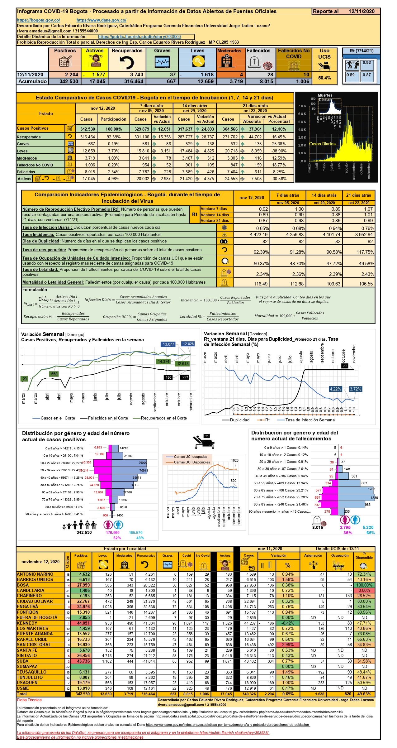 - La capital conserva el primer lugar en grado de infección en Colombia, con 342.533 casos positivos [12.651 en la semana], equivalente al 29,18%. La incidencia es de 4.423 casos positivos por cada 100.000 habitantes, en comparación con un indicador de 21 días atrás, que era de 3.952; el mes de noviembre comenzó con 1.294 casos nuevos por día y para el 12 de noviembre se detectaron 2.204 nuevos casos diarios. Con un 92,39% de recuperación, se alcanzó la cifra de 316.464 personas que superaron el virus [15.358 en la semana], y un saldo de 17.045 casos activos [disminución semanal de 2.987 casos]. Con respecto a la letalidad [fallecimientos a causa del covid], se tienen 8.015 fallecimientos [228 en la semana], que equivalen al 2,34% con respecto al total de casos.