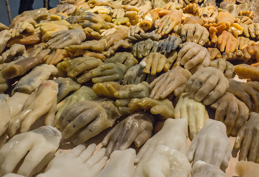 “Como habían accidentes de trabajo o cirugías producto de las enfermedades colaterales del trabajo, entonces hice todo un proceso con confeccionistas y con mi propia mano”, aseguró la artista, quien imprimó las formas de las manos en moldes de silicona de alta definición. Las manos de la muestra representan 5 posturas constantes al manipular textiles y cada una es hecha con un tipo de cera distinto, lo que le otorga cartacterísticas particulares a cada mano.