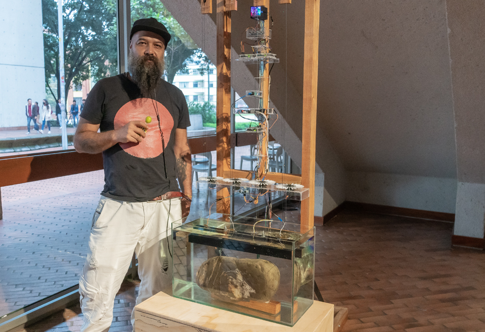 El colombiano, Fernando Montoya, nos habló sobre su obra: "Primera interacción", que es el primer movimiento de cinco como fruto de estar en la parte más alta del río en la Laguna del Otún, (Pereira, Colombia), expresa. "Este es un tema que tiene que ver con el agua. ¿Por qué no hablar con un río? Creo que la electrónica se acerca bastante bien a esa ficción. Es una obra que combina sonidos pregrabados, una recolección sonora de cerca de 100 archivos en la cuenca de río Otún; esos sonidos los transformamos en luz, y la luz a su vez genera un movimiento de motores que activa unas cuerdas".