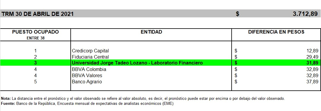 Luego de enviar el reporte de abril sobre las estimaciones de la Tasa de cambio Representativa del Mercado (TRM) al Banco de la República, el Club de Finanzas de Utadeo (Utadeo Finance & Business Club) logró ubicarse en el tercer puesto, entre las centros de análisis financieros del país, luego de ocupar por dos meses consecutivos el cuarto lugar, en esta ocasión, por delante de analistas como BBVA Colombia, BBVA Valores y el Banco Agrario.