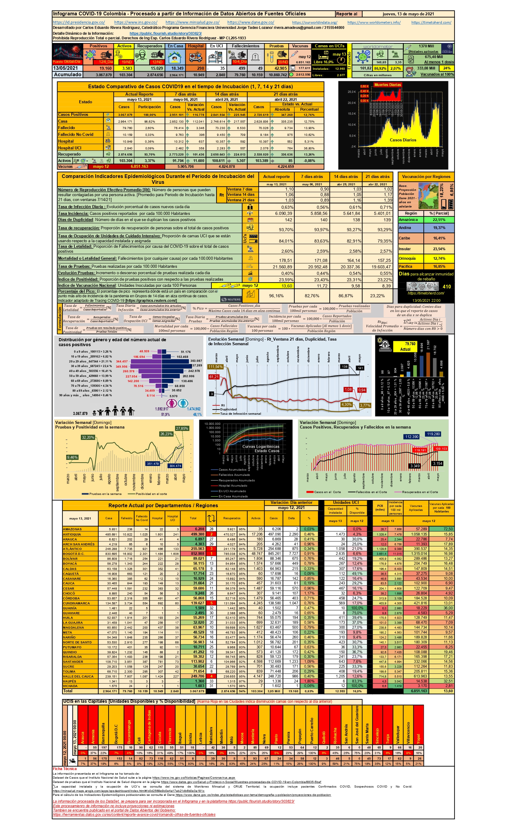 ¿Cómo estará circulando el Covid entre las constantes y multitudinarias congregaciones de personas en nuestro país por más de 15 días?, la respuesta la da el Rt (Indicador de velocidad promedio de infección), el cual medido en la ventana de 14 días, para el 28 de abril, era 1,07 (cada caso positivo puede infectar a 1,07 personas), y para el 13 de mayo es de 1,06, día para el cual se llegó a 3’067.879 casos positivos y 79.760 fallecimientos, ocupando el puesto 12 a nivel global de infección, puesto 6 en nuevos casos por día (13 de mayo con 19.160 eventos), puesto 10 en mortalidad y puesto 4 en muertes diarias (499 fallecimientos). Validando las cifras entre el 6 y 13 de mayo, se tiene que el Rt_7 días pasó de 0,90 a 1,10, lo que es el reflejo de la interacción de personas en las diversas marchas por todo el país, de forma que en 7 días se presentaron 116.778 nuevos casos y se produjeron 3.346 fallecimientos (la tasa de letalidad pasó en una semana de 2,59% a 2,60%, mientras que la tasa de infección diaria pasó del 0,56% a 0,63%). El registro de casos diario más alto que se ha tenido ocurrió el 15 de enero, con 21.078 casos; actualmente en ascenso del tercer pico, para darnos una idea de su ascenso, el 22 de abril nos encontrábamos en el 83,22% del pico anterior, para el 29 de abril 86,87%, 6 de mayo 82,76% y para el 13 de mayo 96,16%.