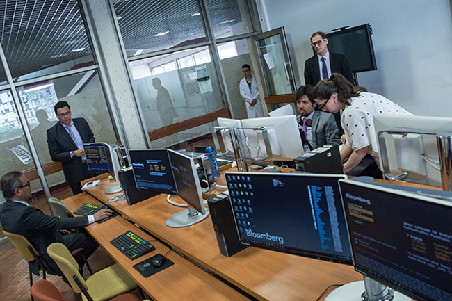 El nuevo laboratorio financiero de Utadeo cuenta con 12 terminales Bloomberg, 30 computadores con Risk Simulator y 40 con EMIS y bases de datos de información financiera.
