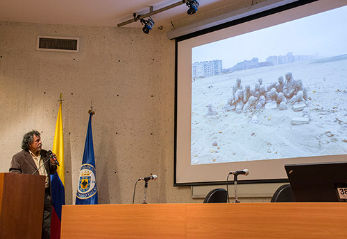 Su charla se tituló “Perspectivas del Protocolo de Kyoto tras las reuniones de Lima 2014 y Paris 2015”. Empezó por enseñar algunos de los resultados del nuevo acuerdo global sobre cambio climático e hizo referencia a expertos del mundo en temas de la problemática medio ambiental. Uno de los datos habla de mil millones de refugiados climáticos hacia el año 2050. En su exposición enseñaba que en la actualidad hay crisis a causa de la sequía, que el gobierno no da prioridad a temas como los que se están viviendo en la Guajira, donde en los últimos 6 años han muerto más de 4.171 niños, lo cual merece declarar emergencia en la región por muerte masiva de niños.