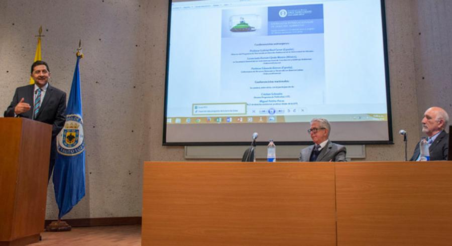 Su charla se tituló, “Incidencia del control fiscal en la situación ambiental de Bogotá”. El contralor hace referencia a las más de cuatro décadas que han pasado desde la conferencia de la ONU sobre el medio ambiente en Estocolmo en 1972, donde se  reconoce el inicio del análisis del desarrollo de la política internacional del medio ambiente, a causa del uso indiscriminado de los recursos naturales, la seguridad y la calidad de vida de los seres vivos. “En 1987 por primera vez se habla de desarrollo sostenible. Nuestro país ha sobresalido en materia de legislación ambiental, protección del medio ambiente. La Constitución Política de Colombia contiene más de 30 artículos referidos a la protección conservación y defensa de los recursos naturales y tuvo especial preocupación por la defensa y conservación del ambiente y la protección de los bienes y recursos ecológicos necesarios para el desarrollo sostenible y el derecho al disfrute de un medio ambiente sano”. A pesar de la buena normativa, el país es víctima de la crisis ambiental del planeta, pues en el índice de desempeño ambiental que cuantifica y clasifica numéricamente el desempeño ambiental en las políticas de un país, Colombia paso del puesto 9 al 85, debido entre otras, a bajos puntajes en tratamiento de pesca, bosques y manejos de aguas residuales que manifiestan el bajo desempeño en la gestión. “La ley 99 de 1993, creada por el Ministerio de Ambiente y organizada por el Sistema Nacional Ambiental, marco un hito importante en materia ambiental porque modificó las estructuras existentes y reevaluó el marco normativo que venía imperando en la materia". Dentro del marco legal se establecieron nuevos órganos como el Ministerio de Ambiente y las CAR, Bogotá cuenta con dos autoridades ambientales como lo son La Secretaria Distrital de Ambiente y la CAR. "La contraloría de Bogotá aplaude el valor de las tutelas y acciones populares y de cumplimiento por parte de la comunidad en especial sobre el río Bogotá, en pro de su defensa”.