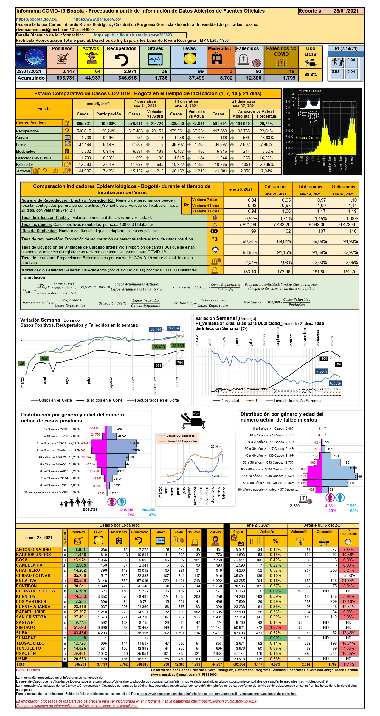 - Bogotá superó la barrera de los 600 mil casos, llegando el 28 de enero a los 605.731 (equivalente a un incremento en 21 días del 20,74% en comparación al incremento del 22,26% medido desde el 1º de enero). La incidencia (casos positivos por cada 100.000 habitantes) está en 7.821. Con respecto a nuevos casos en un día, luego de que el 15 de enero se presentó la cifra récord en la pandemia, con 8.845 casos, ha empezado a disminuir la tendencia y, a 28 de enero, fue de 3.147 casos.