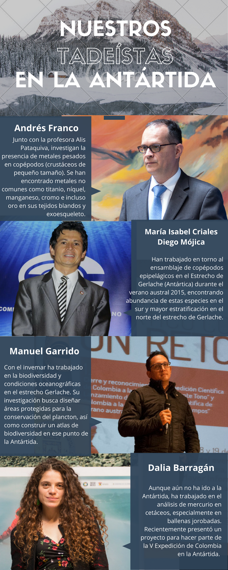 - La profesora tadeísta presentó los resultados preliminares de la investigación "“Metales pesados en copépodos presentes en el Estrecho de Gerlache (0 – 200 m), Península Antártica", en el marco de la tercera Expedición de Colombia a la Antártida "Almirante Padilla", que se llevó a cabo en el verano austral 2016-2017. En el proyecto participan Utadeo, Aquabiosfera e Invemar.