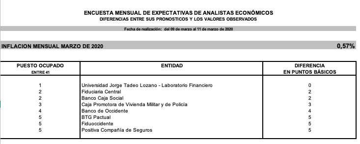 Ranking de las instituciones más acertadas en pronóstico de inflación en la encuesta de expectativas de analistas económicos para el mes de marzo. Fuente: Banco de la República