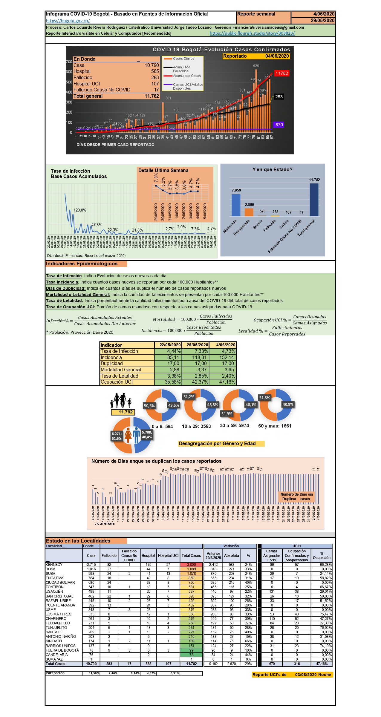 Durante la semana, Bogotá tuvo un preocupante incremento de casos; a corte del 4 de junio, la Alcaldía, en su sitio web, reporta un acumulado de 11.782 casos, que equivalen a 2.620 nuevos contagios, en relación con las cifras de la semana pasada; esto supone un incremento semanal del 29%
