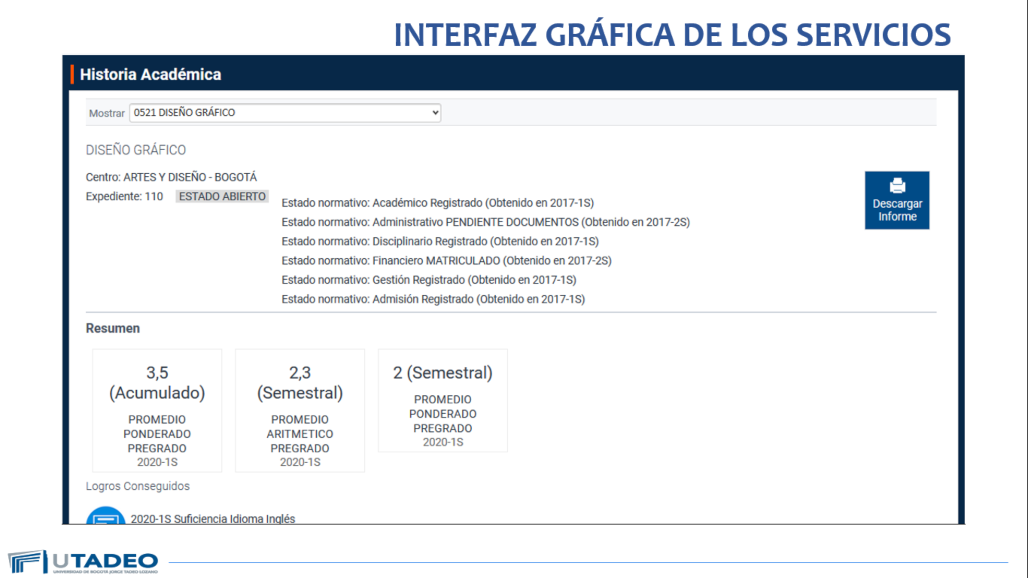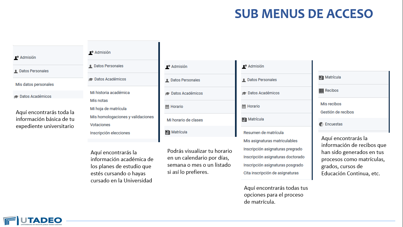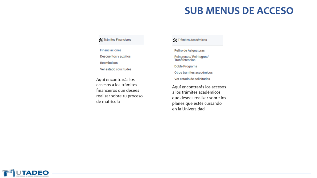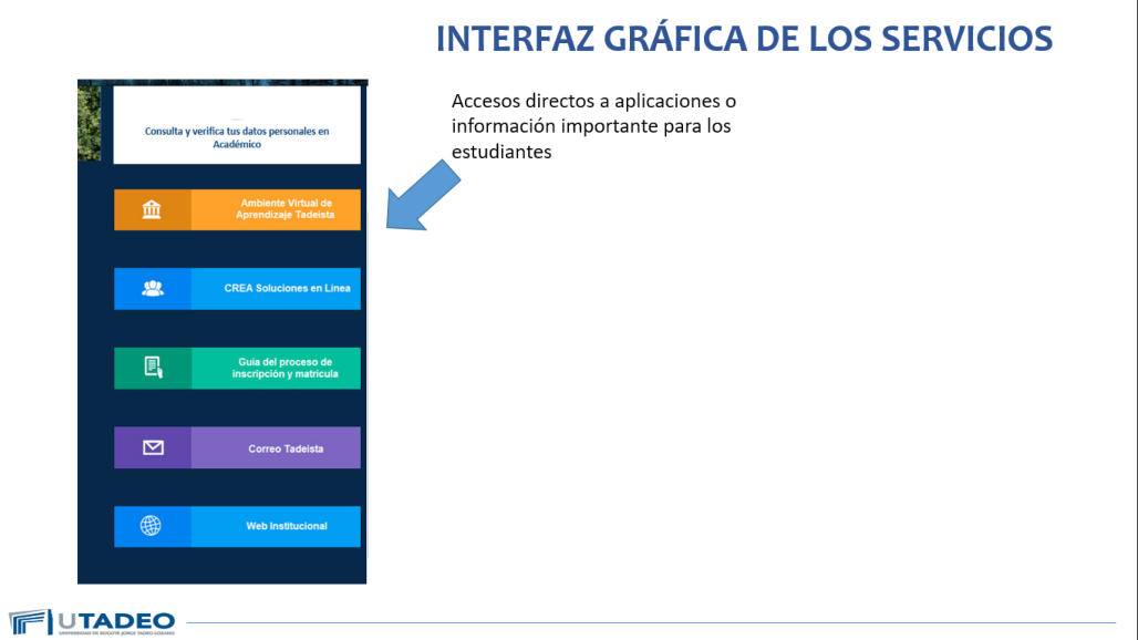 Ten en cuenta que el acceso sigue siendo el mismo. Ingresas a través de la página web de Utadeo y en la parte superior encontrarás un menú en el que podrás ubicar el Portal de Servicios en Línea, donde podrás acceder de manera fácil. Si presentas algún inconveniente, puedes comunicarte con la Mesa de Estudiantes.