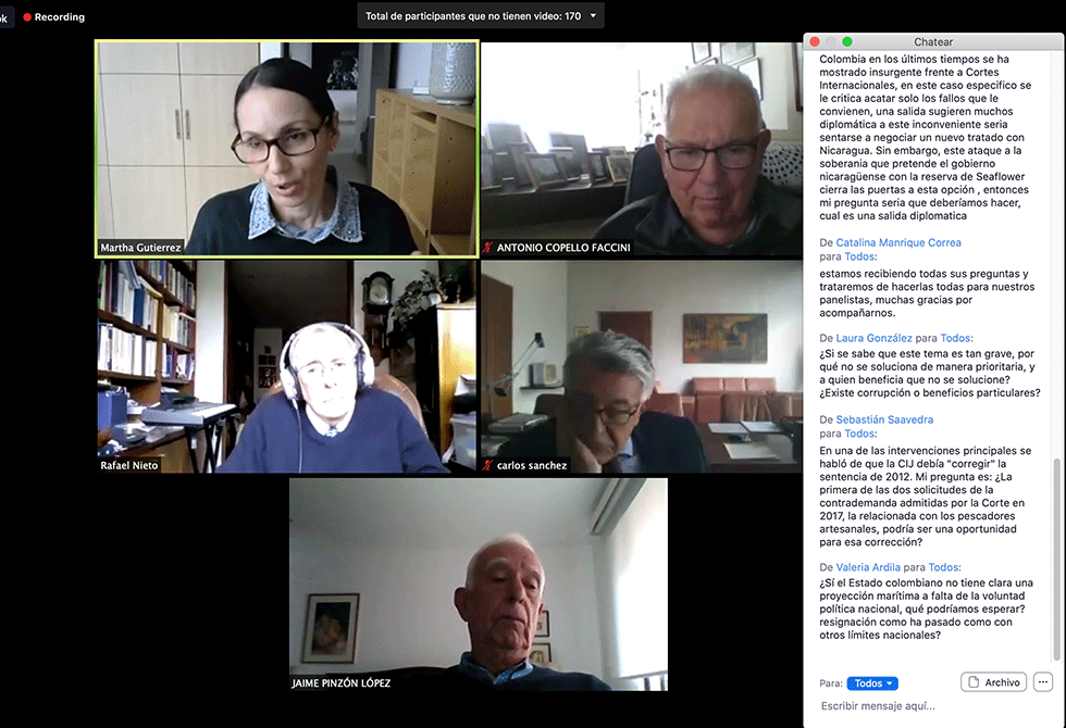 Por último, la profesora Gutiérrez se refirió a los derechos de petición que, en conjunto con su grupo de estudios, interpuso ante el Instituto Agustín Codazzi, la Dirección Marítima (DIMAR) y la Cancillería, con el propósito de determinar algunos aspectos sobre el acatamiento de la sentencia de la corte internacional y las medidas del Ejecutivo sobre la ley establecida por Nicaragua, sin obtener una respuesta positiva por parte de estos organismos.