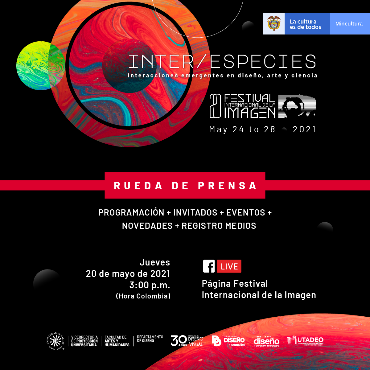 Desde el lunes 24 hasta el viernes 28 de mayo, se realizará de manera virtual la vigésima edición del Festival Internacional de la Imagen en alianza con Utadeo, evento que congrega a los mejores artistas en torno a un ambiente de cultura digital que a lo largo del tiempo ha logrado establecer una red internacional de instituciones, investigadores y creadores, para el intercambio de experiencias y conocimientos, logrando posicionarse como un evento de suma importancia en la esfera internacional en torno al eje diseño, arte, ciencia y tecnología.