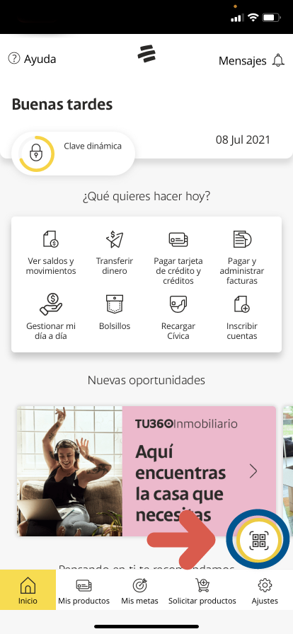 Si tienes cuenta en Bancolombia, en tu celular deberás ir a la App Personas, luego a la opción “Mis productos” y allí seleccionar las opciones “Transferir dinero” y luego “Transferir dinero con código QR”. Posteriormente, deberás permitir el acceso a la cámara y galería de tu celular y leer el código QR o seleccionarlo directamente desde tu galería. Finalmente, realiza la transferencia, indicando el producto origen y el monto a transferir. Si estás seguro de la transacción, puedes presionar “Continuar”. Allí te aparecerá el comprobante de la transferencia, el cual debes guardar para adjuntarlo en tu inscripción del Bono (Obtén más información sobre los códigos QR en Bancolombia).