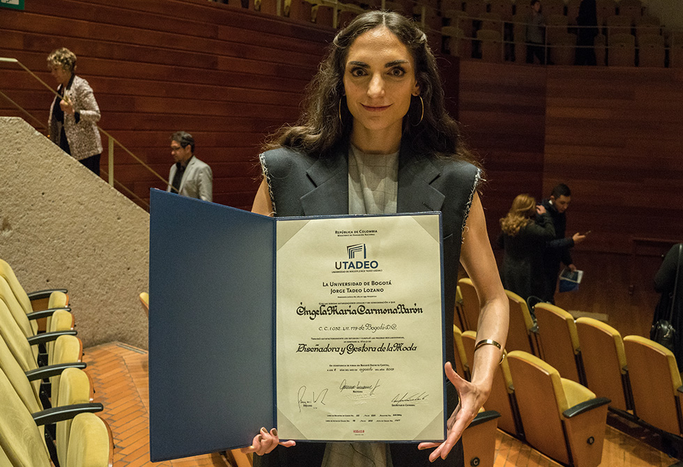 Desde hace ya varios años, Ángela Carmona, hoy egresada del programa de Diseño y Gestión de la Moda de Utadeo, ha hecho parte de esta industria. Sin embargo, el pasado 8 de agosto, en la ceremonia de graduación de pregrado que se celebró en el Auditorio Fabio Lozano, para ella fue como volver a nacer profesionalmente: “Cuando tenía 17 años pensaba que un título profesional no me iba a ayudar, pero con el paso del tiempo me di cuenta que una formación profesional si hacía la diferencia, especialmente para aprender a pensar”, señala.