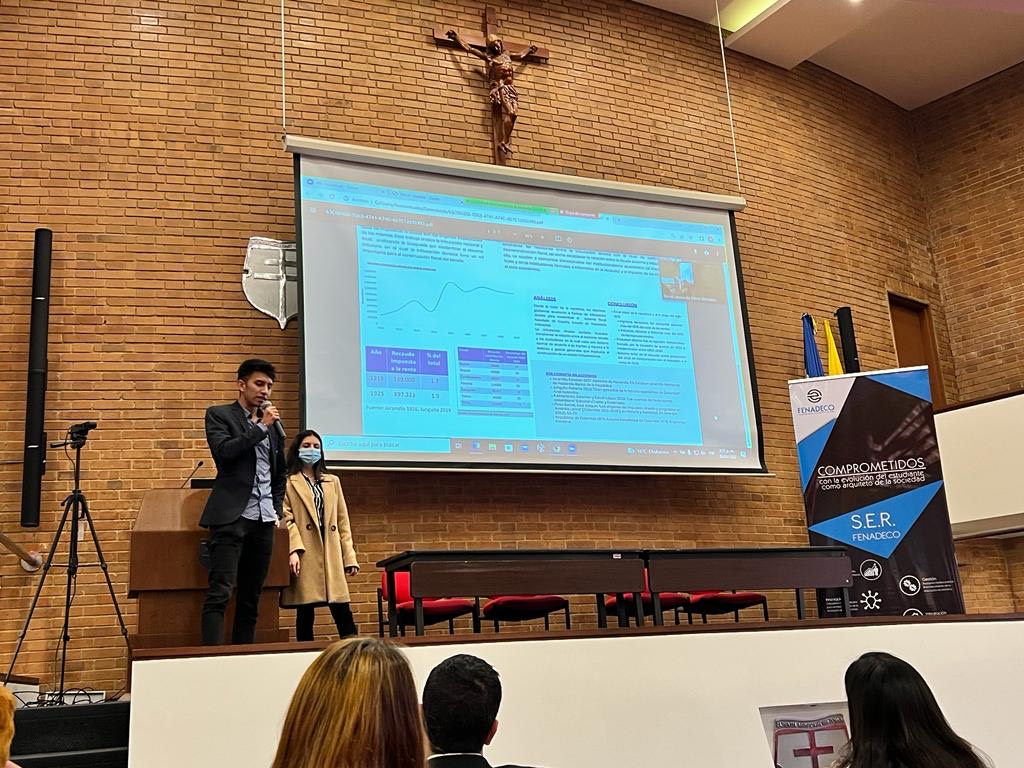 Así se evidenció en el encuentro de Semilleros Fenadeco que se realizó en Bogotá con la participación de estudiantes de diferentes universidades. Los estudiantes Sara Bohórquez del programa de Comercio Internacional y Finanzas, y Julián Nagles del programa de Economía presentaron la propuesta titulada “La modernización de la hacienda nacional: la difícil introducción de la tributación directa en Colombia 1821-1918”.