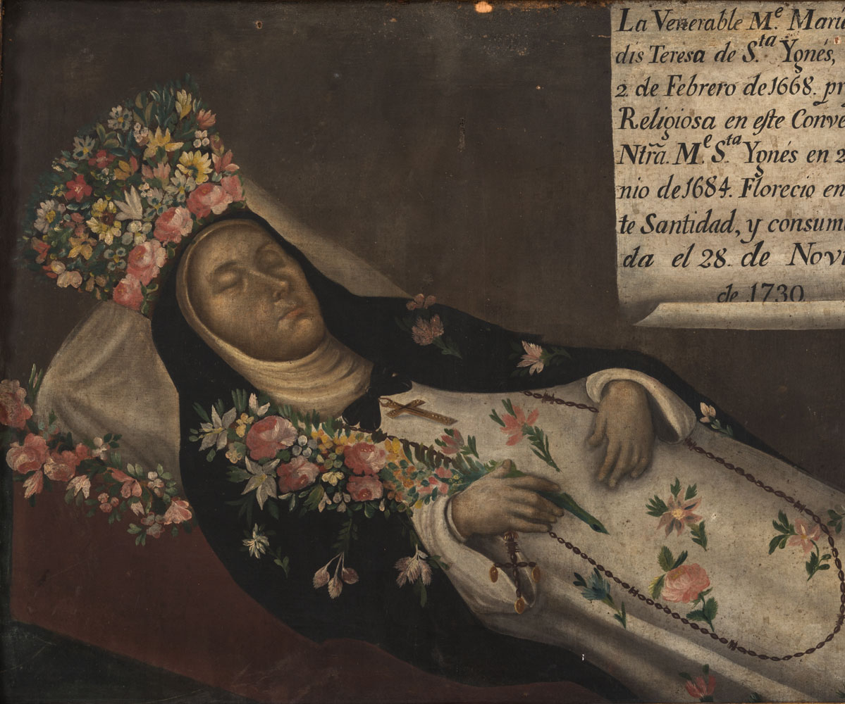 Cuenta la historia que Sor María Gertrudis Teresa de Santa Inés fue una religiosa de clausura perteneciente a la orden de las dominicas, que luego de una vida dedicada a la profesión de su fe murió en el año de 1730, en Santafé. Tres retratos pintados al oleo sobre lienzo que representan el lecho de muerte de la religiosa hablan de un elemento místico y sagrado de la época, un movimiento artístico propio del barroco que devela la alegoría del olor a santidad, la incorruptibilidad del cuerpo y el rejuvenecimiento después de la muerte como virtus o pruebas tangibles del carácter sagrado de los cuerpos de los santos, que son utilizadas para justificar el proceso de canonización ante la Iglesia Católica.