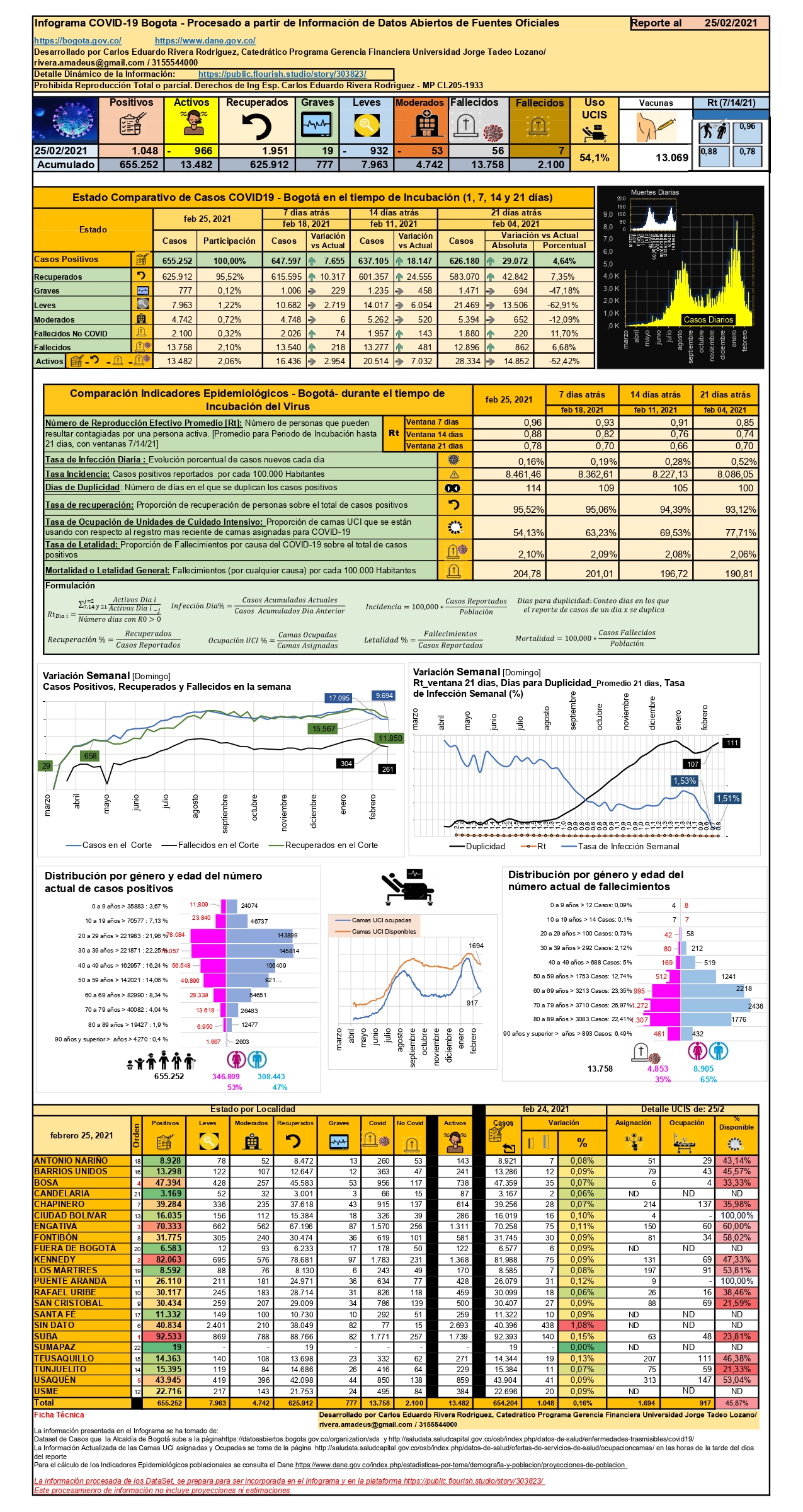 - Para el 25 de febrero, la capital llegó a 655.252 casos (7.655 en una semana). Con respecto a nuevos casos diarios, a corte de este informe, fue de 1.048; la tendencia de la tasa de infección diaria está en descenso en la secuencia 21, 14 y 7 días: 0,52%, 0,28% y 0,19%; el dato actual es de 0,16%