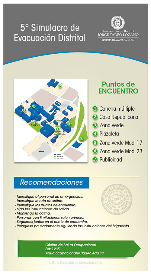 Para conocer qué hacer en caso de emergencia, cómo reaccionar, hacia dónde dirigirse, qué hacer y qué no, y cómo apoyar de la mejor manera el trabajo de quienes tienen a su cargo la seguridad de todos nosotros, la Tadeo realizará el próximo miércoles 16 de octubre desde las 10 de la mañana su simulacro de evacuación.