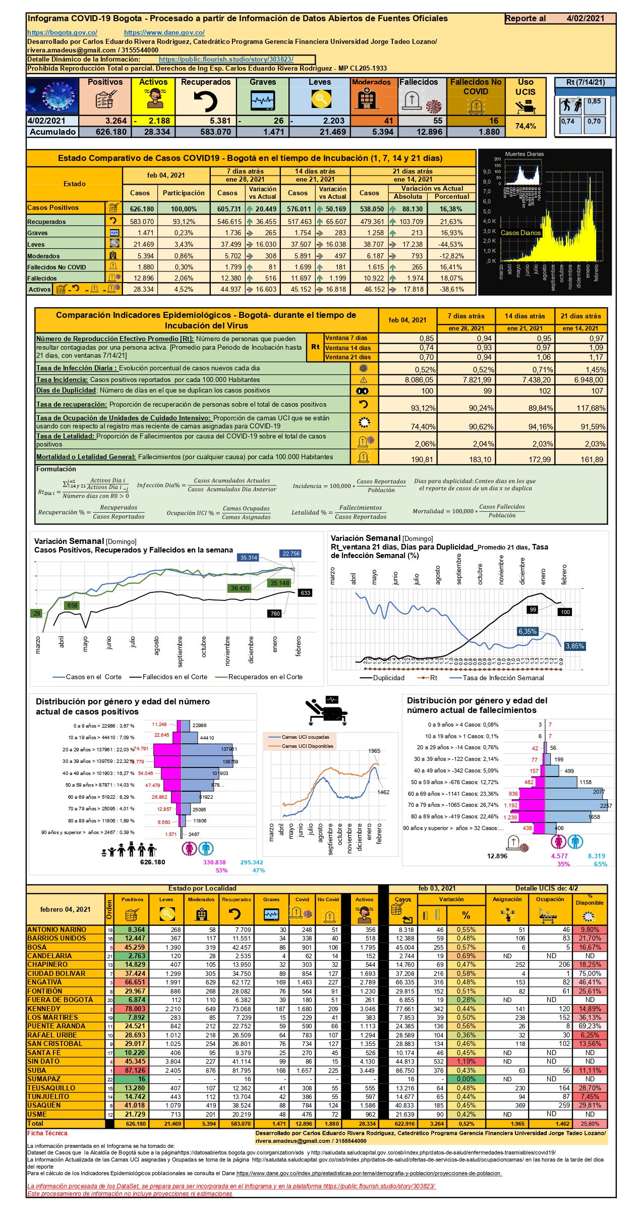 - Para el 4 de febrero, la capital llegó a 626.180 casos (20.449 en una semana). Con respecto a nuevos casos en un día, luego de que el 15 de enero se presentó la cifra récord en la pandemia, con 8.845 casos, ha empezado a disminuir la tendencia, siendo el último registro 3.264 casos; hecho que se ratifica con la tendencia de la tasa de infección diaria en descenso en la secuencia 21, 14 y 7 días, que es de 1,45%, 0,71%, 0,52% y el dato actual también en 0,52%