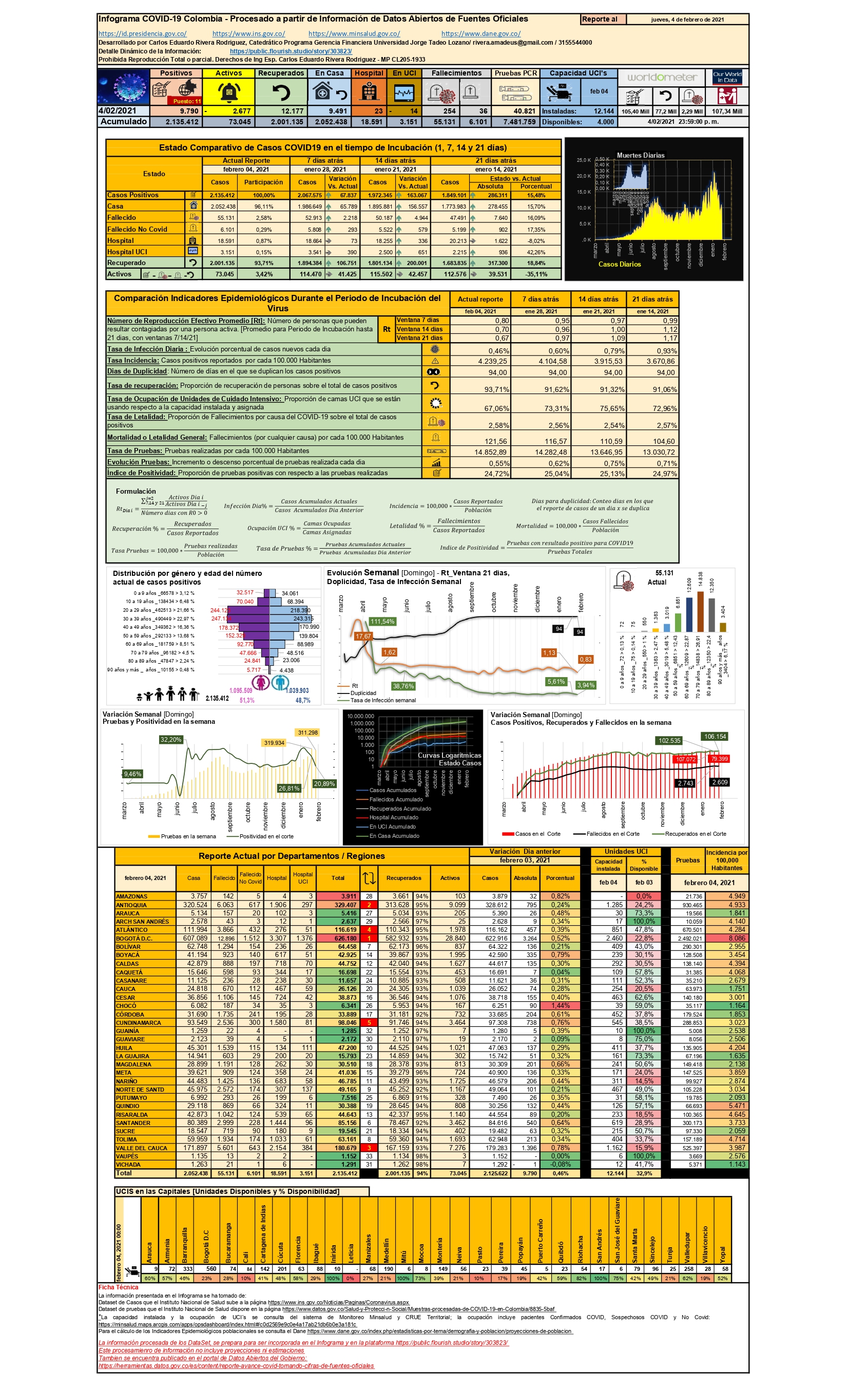 - El 4 de febrero se llegó a 2’135.412 casos positivos (puesto 11 a nivel mundial y puesto 2 en Sudamérica), 55.131 fallecimientos (2,58% del total del país), 2’001.135 pacientes recuperados (93,7% del total) y el segmento de casos activos es de 73.045 personas (3,42% del total). Evaluando el comportamiento diario, a corte de este artículo, se tuvieron 9.790 nuevos casos en un día, así como 254 fallecimientos en el mismo día (puesto 12 a nivel mundial en ambos aspectos)