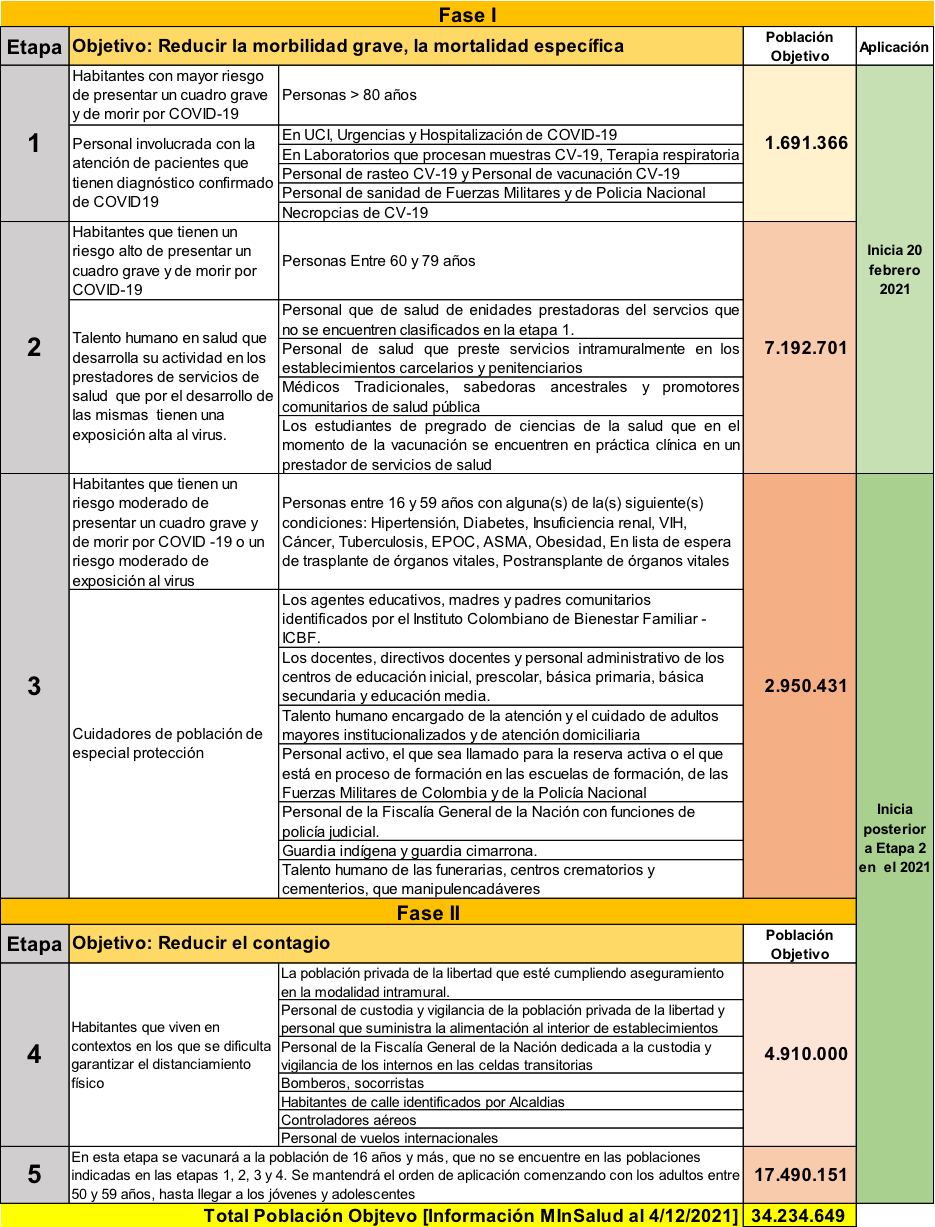 En menos de un mes se cumplirá un año de convivencia con el COVID-19; nos estamos preparando para contrarrestar a este virus por medio de una vacuna, esto con la garantía de un portafolio de 61,5 millones de dosis de vacunas provenientes de diversas casas farmacéuticas: Pfizer (10 millones), AstraZeneca (10 millones), Janssen (9 millones), Moderna (10 millones), Sinovac (2,5 millones), y por medio del mecanismo Covax, 20 millones de dosis (inicialmente de las casas Pfizer y AstraZeneca); en espera del cierre de negociaciones de la vacuna rusa Sputnik V con la que se ampliará dicho portafolio. El Gobierno, mediante el Decreto 109 del 29 de Enero de 2021, estableció los lineamientos del Plan Nacional de Vacunación con el propósito de que el 70% de la población colombiana alcance inmunidad contra el virus; el siguiente cuadro detalla algunos aspectos indicados en el decreto, como la población objeto, las fases y etapas: