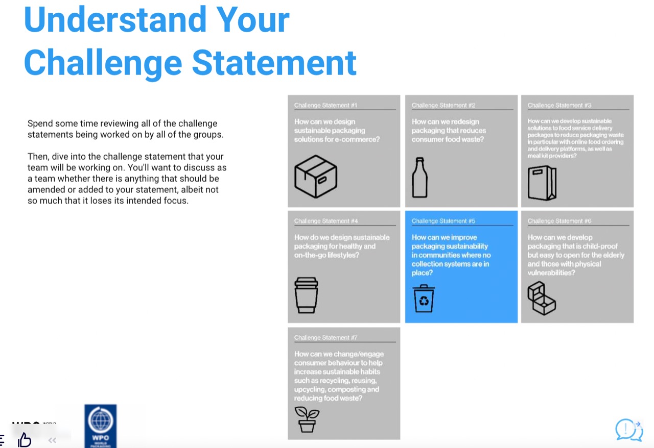 Esta idea surgió tras dos semanas intensas de trabajo colaborativo y de cocreación, que contó con reuniones constantes, implementando metodologías de design thinking y herramientas colaborativas como Miro y Slack. Esta iniciativa buscaba dar respuesta a uno de los siete retos del challenge, el cual consistía en mejorar la sostenibilidad de los empaques en comunidades donde no existen sistemas de recolección.