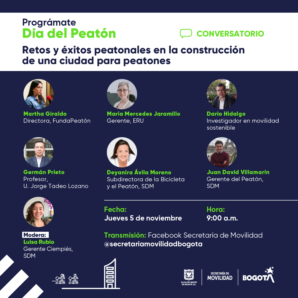 Además, la Secretaría de Movilidad presentó durante el conversatorio la primera edición del Manual del Peatón, una publicación que enseña un marco general no solo de la infraestructura que está disponible para la ciudad, sino también permite identificar las señalizaciones que como peatón se deben conocer e identificar para volver a Bogotá una ciudad caminable.