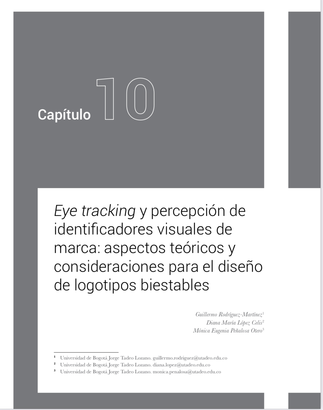 Rodríguez, López y Peñalosa, escribieron un segundo capítulo, el 10 titulado Eye-tracking y percepción de identificadores visuales de marca: aspectos teóricos y consideraciones para el diseño de logotipos biestables. En él se demuestra que existe la posibilidad de producir modulaciones de tipo bottom-up sobre identificadores visuales de marca de naturaleza biestable. La colocación previa de puntos de fijación que favorezcan una determinada configuración perceptual debe estimarse cuando el consumidor esté observando logotipos biestables, de los cuales es posible extractar dos diferentes perceptos, dos diferentes significados.