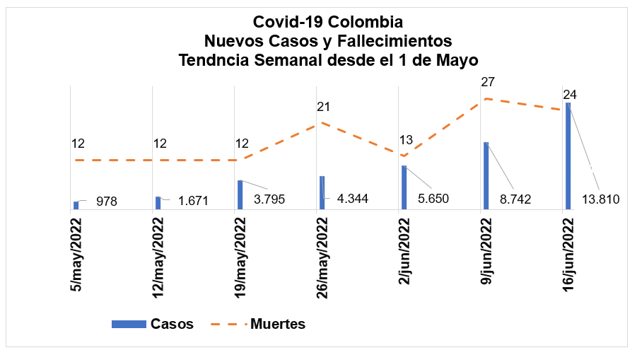 Desde el Ministerio de Salud, se advirtió durante la semana que termina que “El virus sigue circulando y estamos ante la posibilidad de un quinto pico”, y es que la medición por 20 semanas sobre la evolución de la pandemia que inició con el permiso desde el Gobierno de liberar el uso de tapabocas desde el 1 de mayo, muestra una adaptación del virus muy cercana a la endemicidad, contagiando personas, pero no necesariamente llevando a una letalidad; se tiene un aumento continuado de la incidencia -nuevos casos- a saber: 978 casos (30 de abril al 5 de mayo), 1.671 casos (12 de mayo), 3.795 casos (19 de mayo), 4.344 casos (26 de mayo), 5.650 casos (2 de junio), 8.742 casos (9 de junio) y 13.810 casos entre el 10 y el 16 de junio; durante 7 semanas se han confirmado 38.990 nuevos casos a una tasa de incremento semanal promedio del 59,20%, 5.570 casos promedio por semana. A su vez la letalidad (Fallecimientos directos por causa del Covid), presenta 12 eventos (30 de abril al 5 de mayo), 12 eventos (12 de mayo), 12 eventos (19 de mayo), 21 eventos (26 de mayo), 13 eventos (2 de junio), 27 eventos (9 de junio) y 24 eventos entre el 10 y el 16 de junio, de forma que se tiene una ocurrencia durante las 7 semanas de 121 fallecimientos; el gráfico adjunto presenta la tendencia de las cifras: