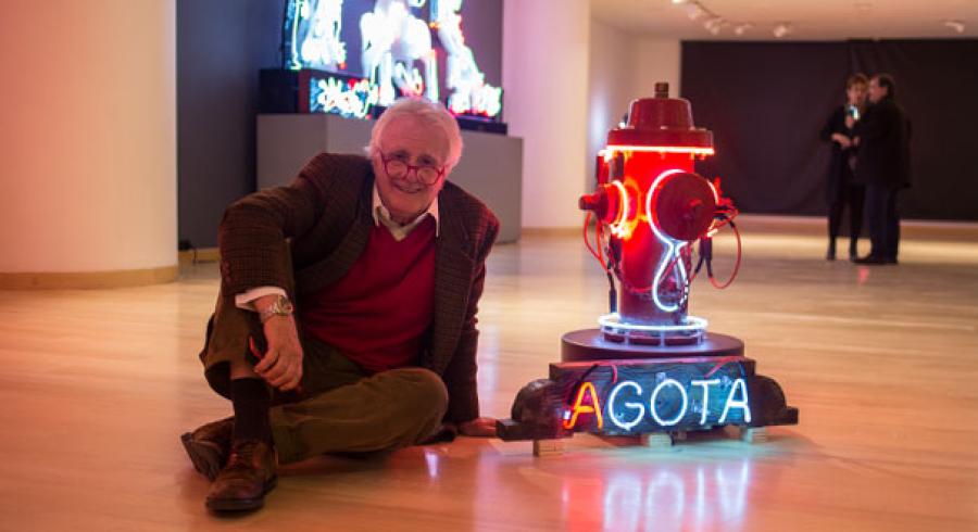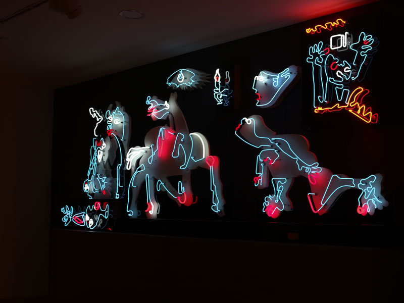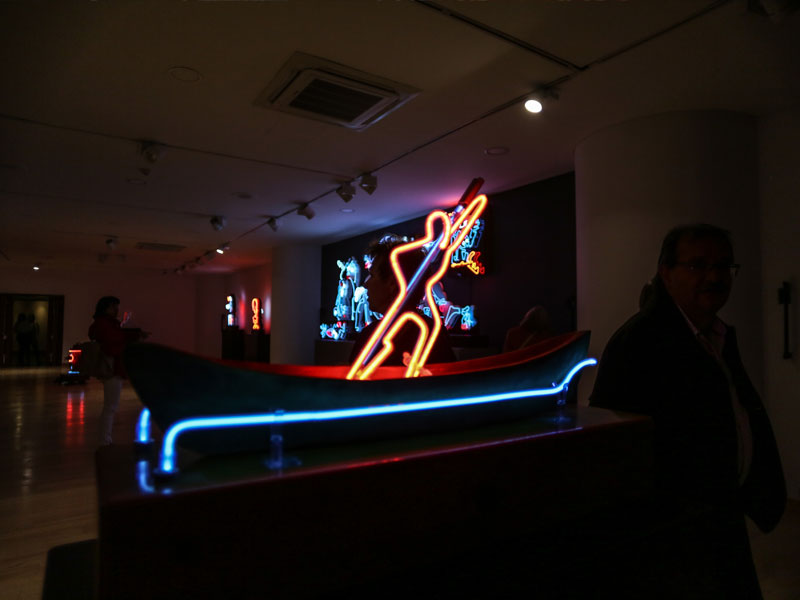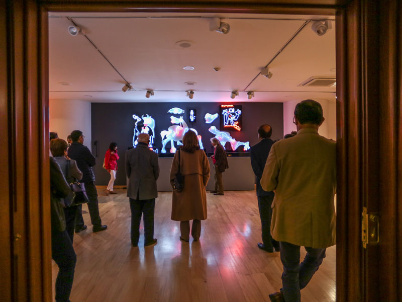 El pasado 11 de julio, la exposición abrió sus puertas al público general con una visita guiada a cargo de Schrader y del curador del club, Carlos Alberto García. Se trató de un recorrido de carácter cercano y ameno a través de las 16 figuras de neón que componen la muestra, aunque también significó un acercamiento a los pensamientos e inquietudes del artista.