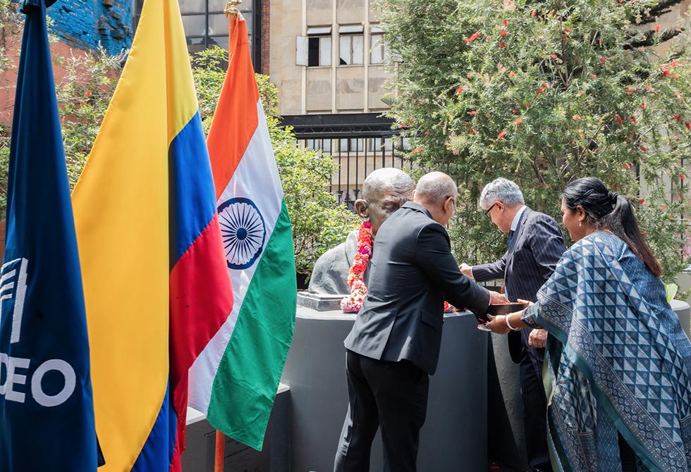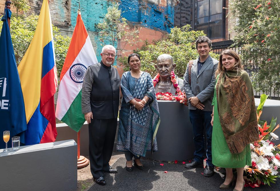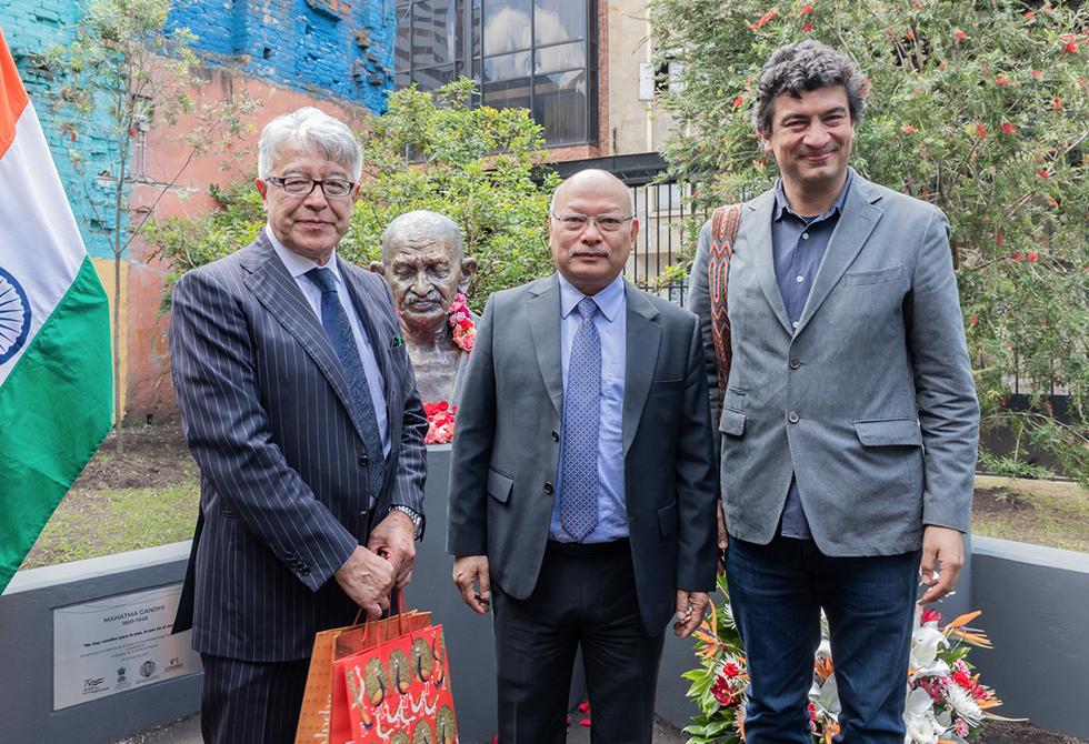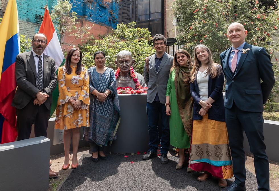 El gobierno de la India, a través de su embajada en Colombia, entregó oficialmente a la Universidad Jorge Tadeo Lozano, el busto con la figura de Mahatma Gandhi, en un acto especial en el que aparte de descubrir el busto se presentó oficialmente el pedestal horizontal inspirado en sus lentes y que es el espacio fundamental de un jardín que desde ya invita a la reflexión y el encuentro con las ideas de este importante líder mundial.
