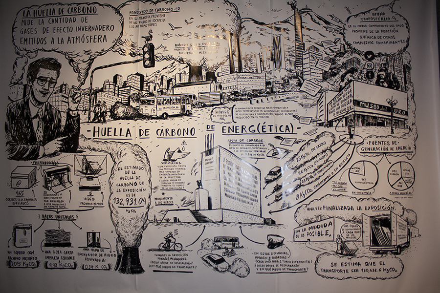 Precisamente sobre ello, José Roca, director artístico de Flora ars+natura y co-curador de la muestra, indica que el proyecto inició en las conversaciones con Andrés García La Rotta de Idartes e Isaac Dyner. La propuesta artística que ahonda en los temas de la energía y la sostenibilidad se finiquitó luego que el Museo de Bogotá otorgara en comodato el Monumento a Los Héroes para la exposición: “El Monumento es un lugar muy particular, muy crudo y grande en el primer piso, pero pequeño en sus siguientes tres niveles, entonces fue un reto conseguir una exposición que se adaptara a las condiciones del lugar”, relata Roca, para quien otra de las apuestas fue no poder hacerle modificaciones al lugar, debido a que es patrimonio arquitectónico, razón por la que tuvo que acudir al montaje de doble pared y estructuras en hierro para colocar las pantallas de la exhibición.