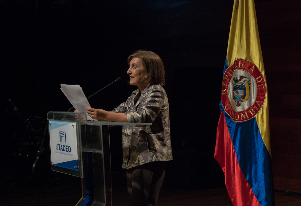 La rectora de Utadeo, Cecilia María Vélez White, dio su último discurso ante las directivas, docentes y los nuevos estudiantes.
